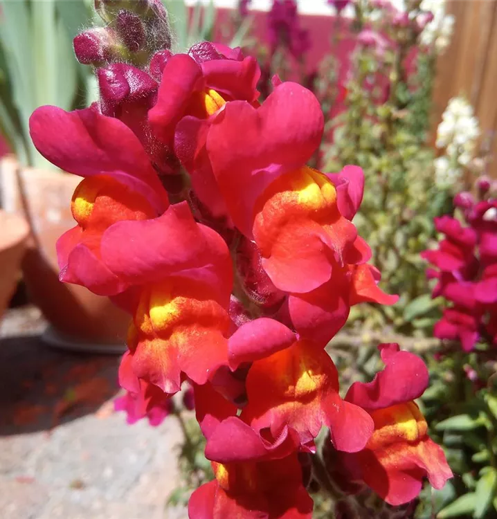 Unermüdlicher Sommerblüher aus Omas Garten: Wenn im Sommer die charakteristischen Rachenblüten des Löwenmäulchen erscheinen, werden Kindheitserinnerungen wach. Drückt man die Blüten seitlich leicht zusammen, öffnen sie ihre Mäulchen, die der Pflanze auch ihren Namen gaben. Sie blühen von weiß bis kräftig rosa in prächtigen, aufrechten Blütentrauben und duften leicht. Das samtige, lanzettliche Laub des Löwenmäulchens wächst buschig und stark verzweigt. Zusammen mit den farbenprächtigen Blüten passt es perfekt ins sonnige Staudenbeet als Lückenfüller. Die eigentlich einjährige Wildform kann milde Winter überleben, vermehrt sich aber auch zuverlässig durch Selbstaussaat. Wichtige Nahrungsquelle für Schmetterlinge und Bienen. Haltbare Schnittblume.