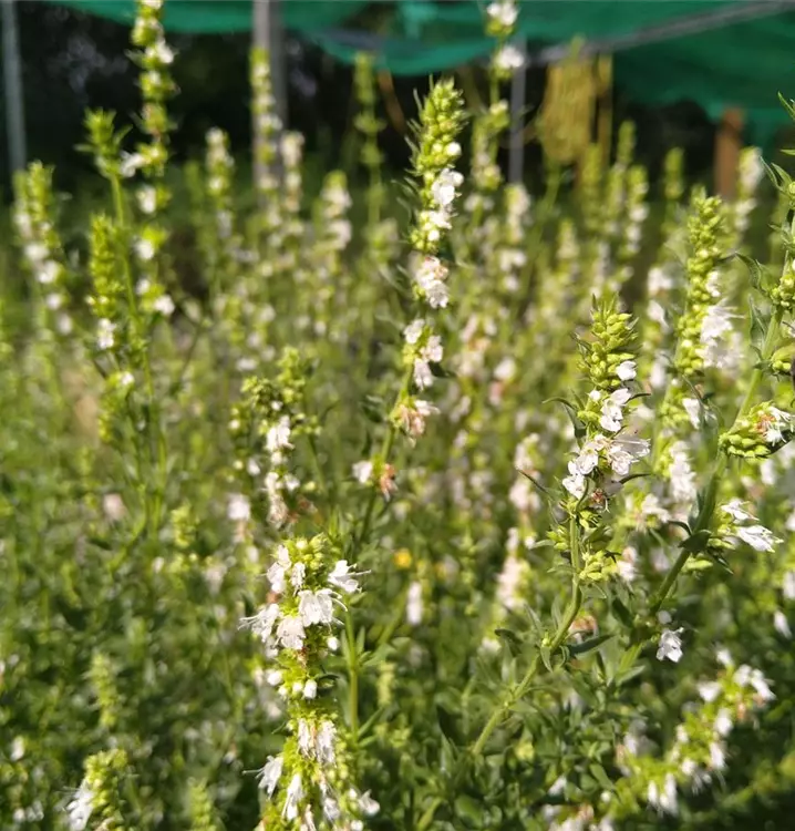 Wirkt magenstärkend und fördert die Verdauung: Diese Ysop-Sorte wirkt, als Tee eingenommen, bei Probleme mit dem Magen oder Darm. Ihre kleinen, dunkelgrünen Blättchen kann man aber auch in der Küche verwenden und in Salate, Bohnen- und Kartoffelsuppen oder Ragouts geben. Die bitter-würzigen Blättchen und jungen Triebe können den ganzen Sommer über frisch geerntet werden. Zum Trocknen schneidet man das Kraut kurz vor oder während der Blüte. Dann ist das Aroma besonders intensiv. Diese Sorte bevorzugt sonnige, steinige Flächen. Im Garten pflanzt man sie unter ähnlichen Bedingungen wie bspw. Thymian und pflegt sie auch wie diesen. Mit seinen hübschen, weißen Blütenähren wird der Ysop nach wenigen Jahren zum Schmuckstück in jedem Kräuterbeet. Im Garten passt Ysop gut ins schottrige Kräuterbeet. Oder in magere Beete zwischen blühende Stauden wie Calamintha sylvatica (Echte Bergminze) und Teucrium chamaedrys (Edel-Gamander). Hervorragende Bienenweide.