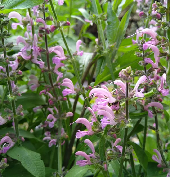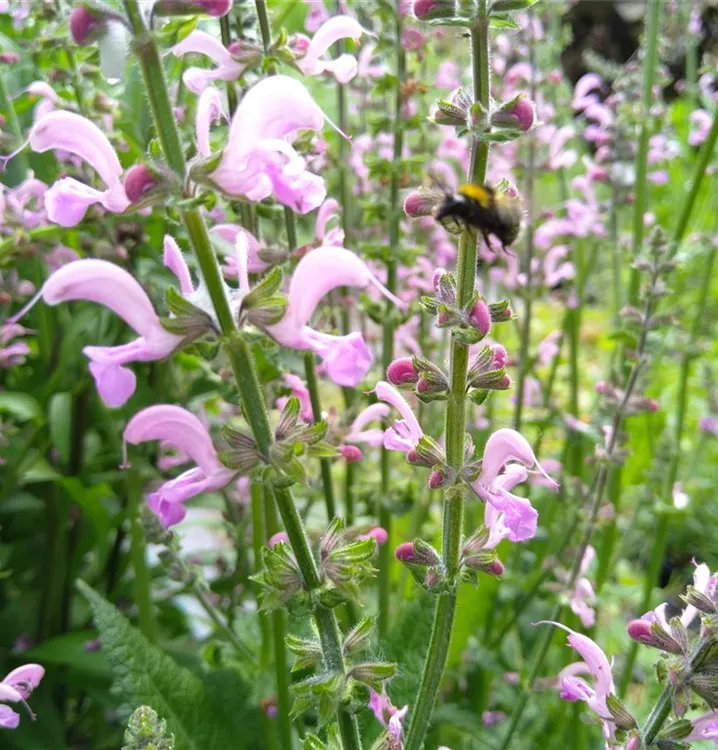 Romantisch anmutende Auslese der Wildform: Mit ihren großen, rosa Blüten, die in lockeren Scheinähren aufrechte Stängel krönen, ist dieser Wiesen-Salbei ein toller Blickfang im Beet. Die Stängel sind deutlich vierkantig und nur spärlich belaubt. Am Grund der Pflanze entwickelt sich ein hellgrüner Blattschopf aus langgestielten, gewellten Blättern. Beim Zerreiben zwischen den Fingern duftet das Laub aromatisch und sehr angenehm. Vor allem die jungen Blätter kann man gut in der Küche verwenden. Sie geben Fleisch- oder Fischgerichten eine spezielle Note und verleihen Salaten oder Gemüsegerichten den letzten Pfiff. Die heilkräftige Wirkung ist bei dieser Sorte weniger ausgeprägt. Ein Tee aus den Blüten fördert jedoch auf milde Weise die Verdauung. Schöne Pflanzpartner für natürlich wirkende Beete sind Pseudolysimachion longifolium Alba (Weißer Langblättriger Blauweiderich) und Calamagrostis x acutiflora Karl Förster (Moor-Reitgras). Gute Bienenweide.