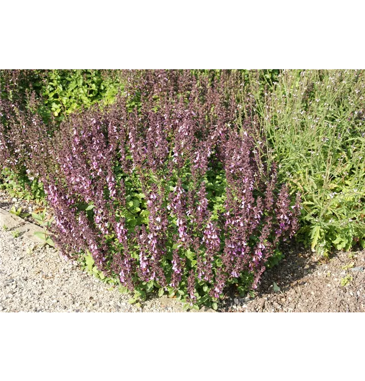 Schöne Staude für die Dachbegrünung: Der aromatisch duftende Edel-Gamander macht sich mit seinem kompakten Wuchs aber auch gut im Vordergrund von sonnig trockenen Staudenbeeten, z.B. zusammen mit Helianthemum nummularium (Gewöhnliches Sonnenröschen) und Gypsophila repens (Kriechendes Gipskraut) gepflanzt. Seine rosa Lippenblüten sitzen in lockeren, quirlartig gehäuften Blütenständen oben am Stängelende zusammen. Auch in den oberen Blattachseln erscheinen einige kleine, sitzende Blütchen. Die aufrechten, verzweigten Stängel des Edel-Gamanders sind locker bis in die Blütenstände mit ovalen Blättern besetzt, deren Blattränder deutlich gekerbt sind. Sie fühlen sich etwas derb an und bleiben auch im Winter grün. Die Pflanze verholzt am Grunde etwas, bildet Ausläufer und wächst mit der Zeit zu ansehnlichen Beständen heran. Die Volksheilkunde verwendet den Edel-Gamander in verschiedenen Zubereitungen zur Stärkung der Verdauung, gegen Gicht und Husten. Von der innerlichen Anwendung des Edel-Gamanders ist aus heutiger Sicht aber abzuraten, da er schädigend auf die Leber wirken kann. Gute Bienenweide.