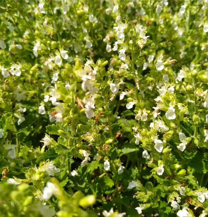 Schöne weißblühende Auslese: Der Edel-Gamander ist ein kleiner Halbstrauch aus der Familie der Lippenblütler, der heutzutage nahezu unbekannt ist. Das ist schade, denn die robuste, anspruchslos Pflanze eignet für vielerlei Gartensituationen. Im sonnigen trockenen Staudenbeet kann man ihn, im Vordergrund gepflanzt, mit Stauden in den unterschiedlichsten Farbtönen kombinieren. Schöne und sehr natürlich anmutende Gemeinschaften lassen sich z.B. mit Thymus praecox (Frühblühender Thymian) und Potentilla tabernaemontani (Frühlings-Fingerkraut) gestalten. Der Edel-Gamander ist mit seinem kompakten Wuchs auch hervorragend für die Dachbegrünung geeignet. Er bildet zügig Ausläufer und wächst so zu dekorativen, üppig blühenden Beständen heran. Seine weißen Lippenblütchen sind im oberen Bereich der Pflanze quirlartig angeordnet und bilden lockere, traubenartige Blütenstände. Das ovale, aromatisch duftende Laub ist am Rand deutlich gekerbt und wurde früher für vielerlei Heilanwendungen benutzt. Von der innerlichen Abwendung des Edel-Gamanders ist aus heutiger Sicht aber abzuraten, da er schädigend auf die Leber wirken kann. Gute Bienenweide.