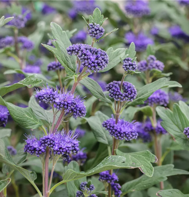 Wenn Sie im Spätsommer einen bezaubernden, dunkelblauen Farbton in Ihrem Beet haben möchten, ist diese kompakte, breit-buschige, locker aufrecht wachsende Bartblumen-Sorte genau die Richtige. Sie hat eine Vielzahl dünner, grundständiger Jahrestriebe. Die Seitentriebe sind locker aufrecht. Der Sofortblüher hat bereits im ersten Jahr reichlich von den stern- und strahlenförmigen Blüten an den 5 - 8 cm langen Rispen. Noch im Oktober hört man das Summen der geschäftigen Bienen und Hummeln. Es ist ein beruhigendes Schauspiel. Das grau-grüne Blatt ist lanzettlich. Die tiefgehenden Hauptwurzeln sind wenig verzweigt und passen sich auch an ungünstige Standorte an. Die Pflanze ist kalkverträglich und mag es schwach sauer bis alkalisch. Im Frühjahr unbedingt zurückschneiden, aber bitte nicht zu tief ins alte Holz. Als Frostschutz den Boden mit Blättern oder Tannenzweigen abdecken.