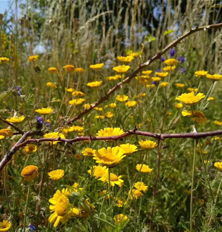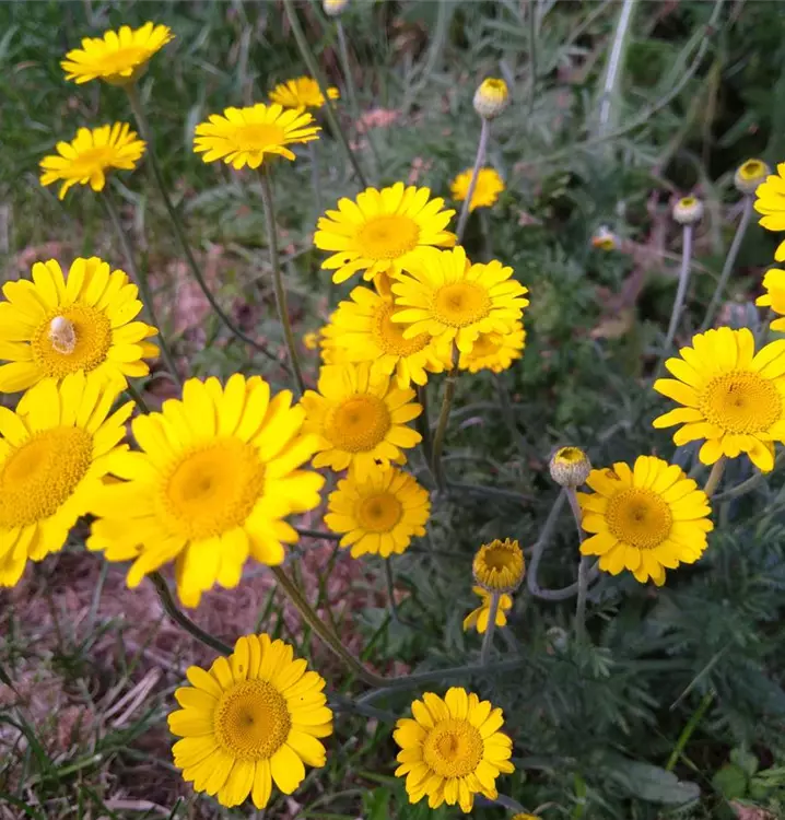 Alte Färbepflanze mit zahlreichen gelben Blüten: Das freundliche, unkomplizierte Korbblütengewächs setzt gelbe Farbakzente, z.B. auf großen Trockenmauerkronen. In sonnigen Beeten lässt es sich gut kombinieren mit Gräsern und Wildstauden wie Natternkopf (Echium vulgare), Taubenkropf-Leimkraut (Silene vulgaris), Kugel-Lauch (Allium sphaerocephalon) und Alpen-Raugras (Stipa calamagrostis). Die Färber-Hundskamille wächst buschig und bildet dichte Horste. Die behaarten Stängel dieser aus Europa und Westasien kommenden Staude tragen hübsches, mehrfach gefiedertes Laub, das intensiv duftet. Es ist unterseits ebenfalls behaart. Zum Ende hin verzweigen sich die Stängel und tragen die langgestielten, auffallenden gelben Blüten. Sie werden gerne von Wildbienen angeflogen und können zum Gelbfärben von Naturfasern benutzt werden (lat. Tinctor = Färber). Für bspw. 500 g Wolle benötigt man ebenso viele frische Blüten. Die Volksheilkunde nutzt ihre Heilwirkungen schon seit der Antike bei Leberleiden, Schlangenbissen und Blähungen. Färber-Hundskamille ist zweijährig. An zusagenden Standorten breitet sie sich zuverlässig durch Selbstaussaat aus, wird aber nie zur Plage. Gute Schnittblume.