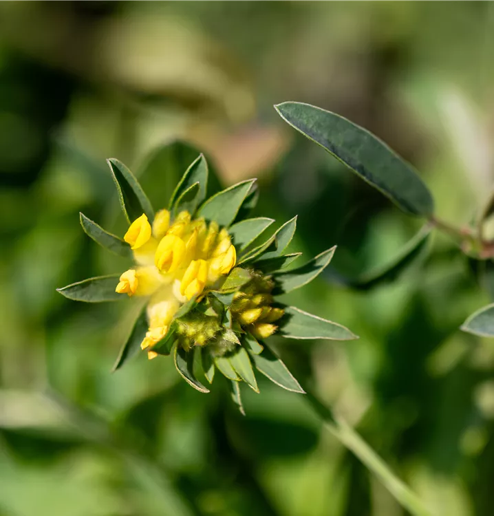 Unscheinbares Pflänzchen, vielseitig einsetzbar: Der Gewöhnl. Wundklee ist Heilpflanze, Gründüngung, Erosionsschutz und hervorragende Bienenweide in einem. Wie der Name schon andeutet, wird er vor allem wegen seiner positiven Wirkung bei der Heilung von Wunden (lat. vulneraria = Wund) schon lange geschätzt. Der anspruchslose Schmetterlingsblütler wächst kriechend am Boden. Auf aufrechten, dicht belaubten Stängeln sitzen endständige kugelige Blütenstände. Sie bestehen aus zahlreichen kleinen Einzelblüten, die wichtige Nektarquellen Hummeln oder Schmetterlinge sind. Bei intensiver Sonneneinstrahlung erscheinen sie zunehmend rötlich überhaucht. Der Gewöhnl. Wundklee stammt aus Europa und Nordafrika. Hier wächst er wild von den ebenen bis zu den alpinen Lagen und verträgt dementsprechend auch raueres Klima. Wie pflanzen ihn gerne mit seinen natürlichen Begleitern, wie Wimper-Perlgras (Melica ciliata), Feld-Thymian/Quendel (Thymus pulegioides), Goldhaar-Aster (Aster linosyris) und Rundblättrige Glockenblume (Campanula rotundifolia).