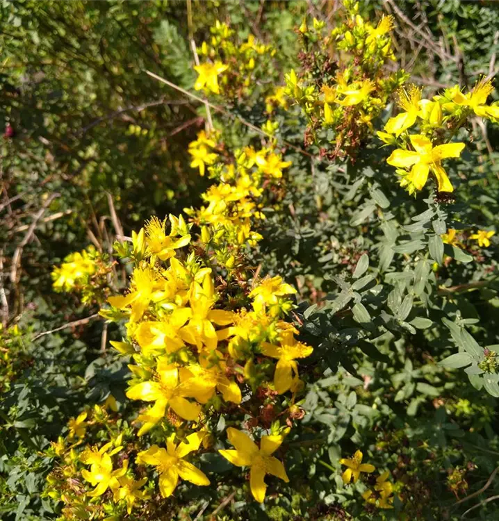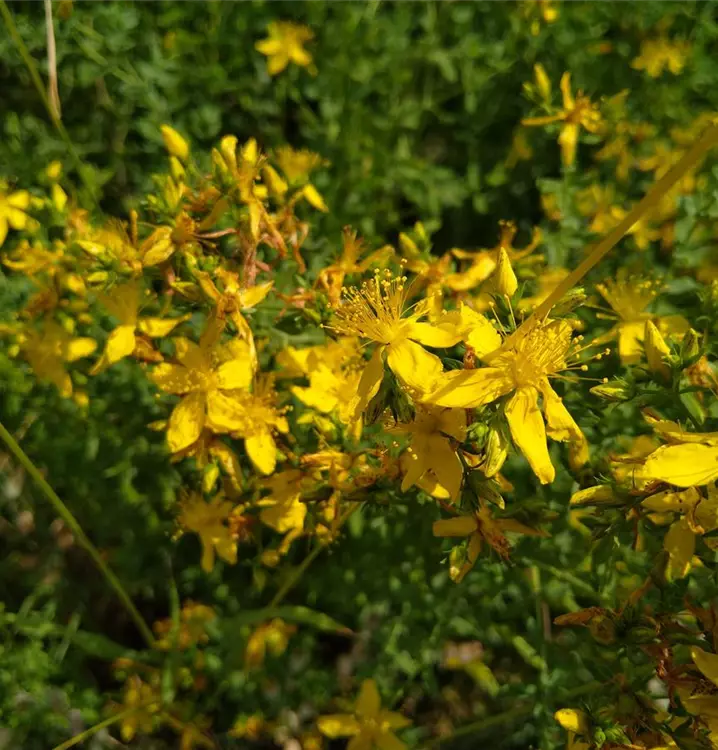 Große Heil- und Zauberpflanze: Das Tüpfel-Johanniskraut blüht in gelben Sternblüten an üppigen Doldenrispen. Es wächst im Garten gut bei Trockenmauern oder einer lichten Gehölzhecke. Eine Kombination mit Sedum telephium ssp. telephium (Purpur-Fetthenne), Silene vulgaris (Taubenkropf-Leimkraut) und Allium vineale (Weinbergs-Lauch) sieht besonders schön aus. Berühmt ist das Tüpfel-Johanniskraut jedoch vor allem wegen seiner inneren Werte. Das aus der Pflanze hergestellte Rotöl wirkt (äußerlich angewendet) bei Verbrennungen und Prellungen. Bei Hautleiden verwendet man das Tüpfel-Johanniskraut zusätzlich innerlich. Heute schätzt man in erster Linie die antidepressive und beruhigende Wirkung der Pflanze. Bei Ein- und Durchschlafstörungen, nervöser Unruhe und Angstzuständen kann Tüpfel-Johanniskraut zur Linderung beitragen. Besondere Wirkung sagt man ihm in alten Geschichten nach, wenn es in der Johannisnacht (24. Juni) geerntet wird. Mit Bedacht anwenden, da allergische Reaktionen auf die Pflanze möglich sind.