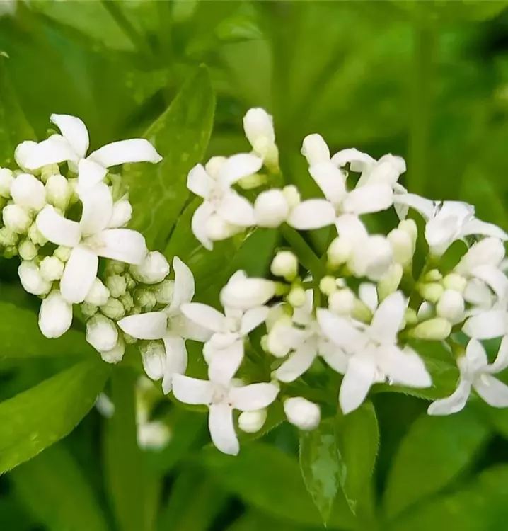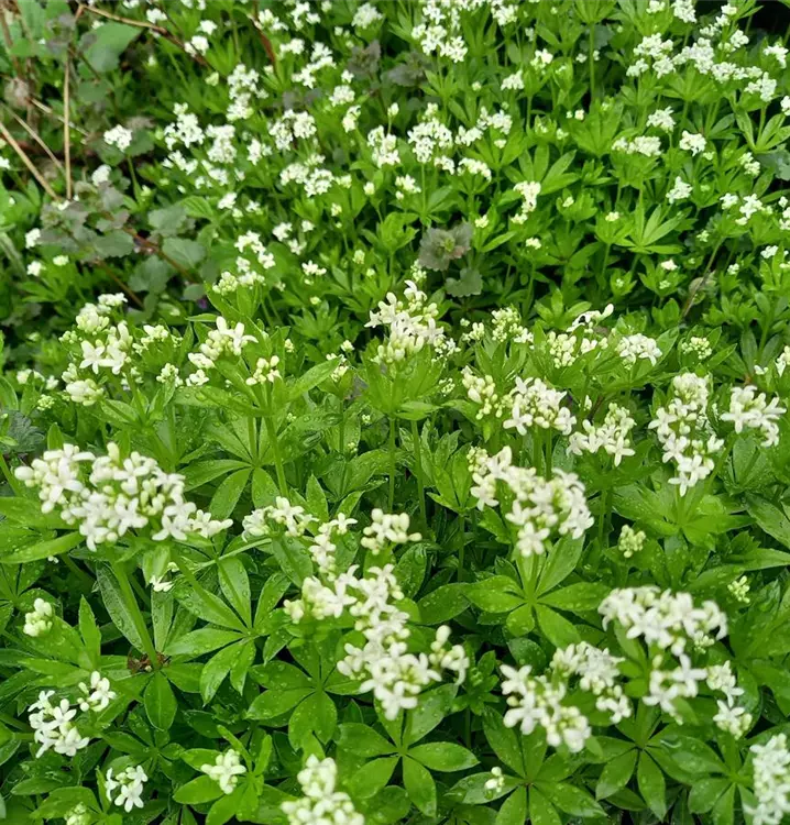 Charakteristisch duftendes Laub: Als ausgesprochene Waldpflanze braucht der Waldmeister feuchten, humusreichen Boden und Schatten. Fühlt er sich wohl, bildet er kurze Ausläufer und macht sich kriechend breit. Man kann ihn daher gut als Bodendecker einsetzen, z.B. zur Unterpflanzung von Strauchgruppen. Gleichzeitig ist das locker buschig wachsende Pflänzchen ein gutes Würz- und Heilkraut. Die Blätter, die in Quirlen um den Stängel stehen, haben beruhigende Wirkung. Für Schlaftee erntet und trocknet man sie zur Blütezeit. Vor übermäßigen Gebrauch ist jedoch abzuraten. Kann Übelkeit und Kopfschmerzen hervorrufen. Mit den kleinen, weißen Sternblütchen aromatisiert man im Mai die traditionelle Mai-Bowle. Noch ein Tipp: Den Waldmeister vor dem Gebrauch anwelken lassen. So entwickelt sich das Aroma noch intensiver.