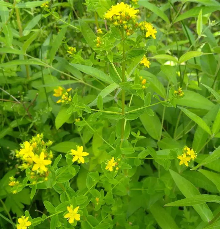 Macht sich gut am Teichrand: Seinen Namen hat das Geflügelte Johanniskraut wegen der Form seines Stängels. Er ist kantig und hat vier schmale Flügelleisten. Zudem ist er apart dunkelrot gefärbt und dicht besetzt mit kleinen, eiförmigen Laubblättchen in sattem Grün. Das Geflügelte Johanniskraut wächst aufrecht und breitet sich zügig über unterirdische Ausläufer aus. Mit der Zeit entstehen so ansehnliche Horste, die gut am Teichrand gedeihen. Das entspricht auch den Bedingungen am Naturstandort, denn wild wächst diese Art gerne an feuchten bis nassen Stellen, wie Ufern und Bächen. Das Geflügelte Johanniskraut hat, anders als sein Verwandter, das Tüpfel-Johanniskraut (Hypericum perforatum), keine heilkundliche Bedeutung. Aber es ist eine Zierde im naturnahen Garten und setzt mit seinen rispigen Blütenständen angenehme, gelbe Akzente zwischen Alchemilla xanthochlora (Gewöhnlicher Frauenmantel) und Silene flos-cuculi (Kuckucks-Lichtnelke).