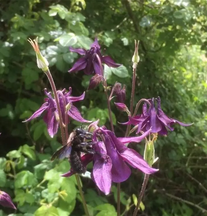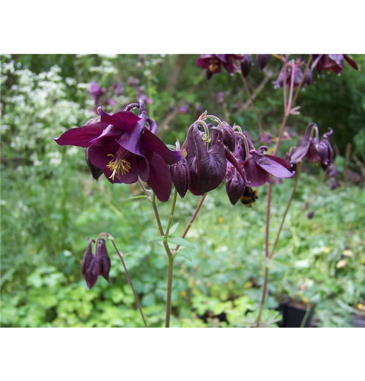 Die dunkelste Art der einfach blühenden Akeleien: Ihre attraktiven, glockenartigen Blüten schimmern dunkel braun-violett und besitzen auffällige Staubblätter, die weit aus der Blüte hinausragen. Die endständigen, nickenden Blüten sitzen zu mehreren auf aufrechten, oben leicht verzweigten Stängeln. Das feine Laub dieser Akelei ist doppelt dreiteilig. Am Grund der Pflanze wächst es auf langen Stielen rosettenartig um die aus der Mitte nach oben strebenden, aufrechten Stängel. Mit ihrem locker-horstigen Wuchs wirkt die Schwarzviolette Akelei besonders gut als verbindendes Element zwischen anderen, auffälligeren Pflanzpartnern, wie z.B. Wiesen-Kerbel (Anthriscus sylvestris), Baldrian (Valeriana officinalis) und Wolliger Hahnenfuß (Ranunculus lanuginosus). Sie verwildert auch gerne unter Büschen und im lichten Schatten von Bäumen, verträgt aber auch volle Sonne.