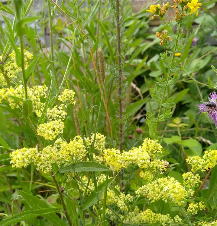 Herrlich gelbe Blüten mit aromatischem Honig-Duft: Das Echte Labkraut wird in der Volksheilkunde wegen seiner heilenden und kräftigenden Effekte geschätzt. Es wirkt positiv auf Bauchspeicheldrüse, Blase, Haut, Leber und Nieren. Man sammelt das Kraut im blühenden Zustand und setzt es frisch oder getrocknet ein. Die äußere Anwendung erfolgt idealerweise als Frischblattauflage. Für Waschungen und Umschläge geht aber auch ein Absud. Für die innere Anwendung eignet sich ein Teeaufguss. Neben diesen vielfältigen Eigenschaften punktet das Echte Labkraut aber auch als zierendes Element im Stauden- oder Kräuterbeet. Das unterseits weich behaarte, linealisch-spitze Laub steht in den für die Labkräuter charakteristischen Quirlen. Die Blütenstände sind vielblütig, dicht und rispenartig. Sie haben eine tolle Fernwirkung und passen gut zu Salvia pratensis (Wiesen-Salbei), Leucanthemum ircutianum (Fettwiesen-Margerite) und Centaurea jacea ssp.jacea (Wiesen-Flockenblume).