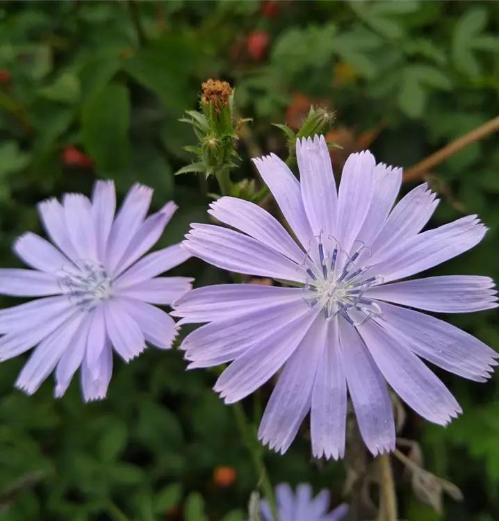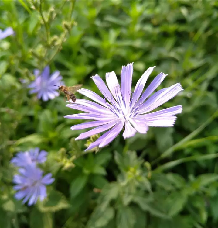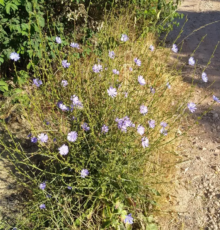 Machtvolle Zauberpflanze der alten Ägypter und Germanen: In einem ägyptischen Papyrustext von Plinius aus dem 4. Jahrtausend v. Chr. ist zu lesen: Wenn man sich mit dem mit Öl vermischten Saft der ganzen Pflanze salbe, so würde man von anderen mehr Gunstbezeigungen und alles, was man wolle, erhalten. Auch die Germanen sagten ihr nach, mit ihrer Hilfe könne man verschlossene Türen ebenso öffnen wie verschlossene Herzen. Sie machte hieb- und stichfest, gab dem Träger Bärenkräfte und brachte ihm Schönheit und Liebe. Und nicht nur deshalb lohnt es sich, die Wegwarte im eigenen Garten anzusiedeln. Diese wunderschöne Pflanze vermittelt eine beruhigende Leichtigkeit und vertreibt müde, schwerfällige Gedanken. Sie liebt sonnige Plätze, die sie sich gerne teilt mit der Roten Spornblume (Centranthus ruber) und der Weißen Sorte Centranthus ruber Albus. Schneidet man im Rhythmus von ca. 4 Wochen immer einzelne Pflanzen aus dem Bestand bodennah zurück, treiben sie neu aus und blühen bis zum Herbst durch. Die blauen Körbchenblüten der Wegwarte bestehen aus zweireihig angeordneten Zungenblüten. Sie sitzen endständig auf sparrig verzweigten Stängeln mit länglich-lanzettlichem Laub. Die jungen Blätter kann man im Salat oder in gekochter Form verwenden. Sie haben eine reinigende und entschlackende Wirkung auf den Organismus und die Haut. Der herbe bis bittere Geschmack lässt sich durch Überbrühen mit kochendem Salzwasser (2 TL Kochsalz auf 1 Liter Wasser), das nach 2 bis 3 Minuten abgegossen wird, deutlich mildern. Nahrungspflanze für Wildbienen, Fliegen und Käfer.