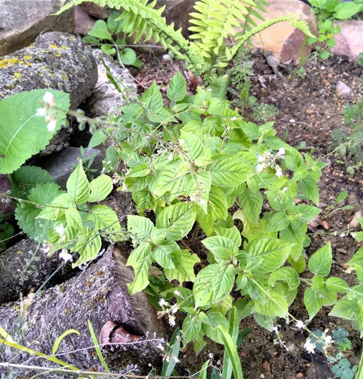 Das Große Hexenkraut wächst im Unterholz dichter Auwälder und ist somit ein idealer Kandidat für feuchte, schattige Ecken im Garten. Diese alte Zauberpflanze lässt von Juni bis August zierliche Blüten über großen, herzförmigen Blättern sehen. Der Pflanzensaft wirkt aufgrund der enthaltenen Gerbstoffe blutstillend und desinfizierend.