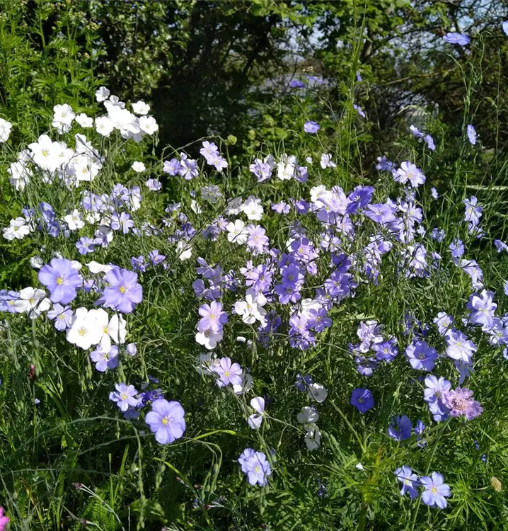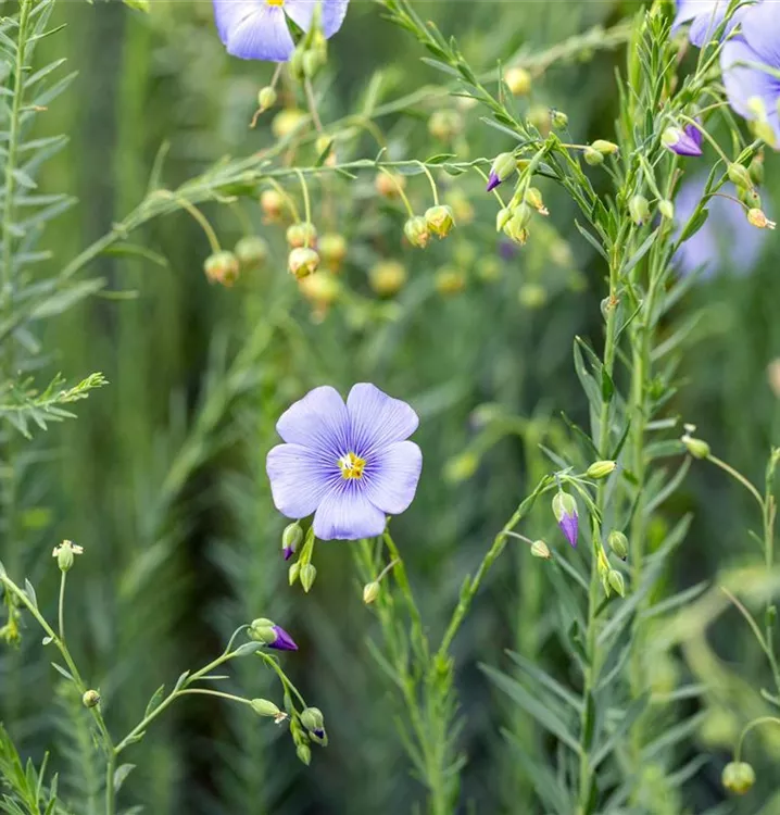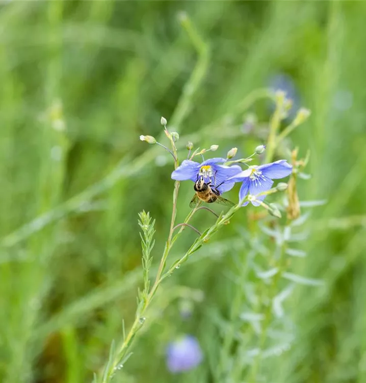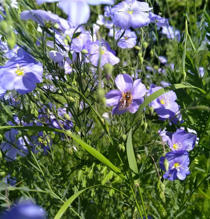 Wunderbare hellblaue Blüten: Der Ausdauernde Lein öffnet seine zarten, schalenförmigen Blütchen allerdings nur in den Morgenstunden. Dafür blüht er ausdauernd den ganzen Sommer über und sorgt als blauer Farbtupfer für Abwechslung im Steingarten. Durch die üppige Selbstaussaat vagabundiert er durch die Pflanzung. Man kann sich die zierliche Wildstaude aber auch im Kübel auf den Balkon holen. Der Stängel des Ausdauernden Leins ist am Grund leicht gebogen und wächst dann aufrecht weiter nach oben. Am oberen Stängelende verzweigt er sich und trägt jeweils mehrere Blüten, die locker doldenartig zusammensitzen. Ausdauernder Lein ist dicht besetzt mit feinem, fast nadelartigem Laub in Graugrün. Kann für die extensive Dachbegrünung eingesetzt werden.