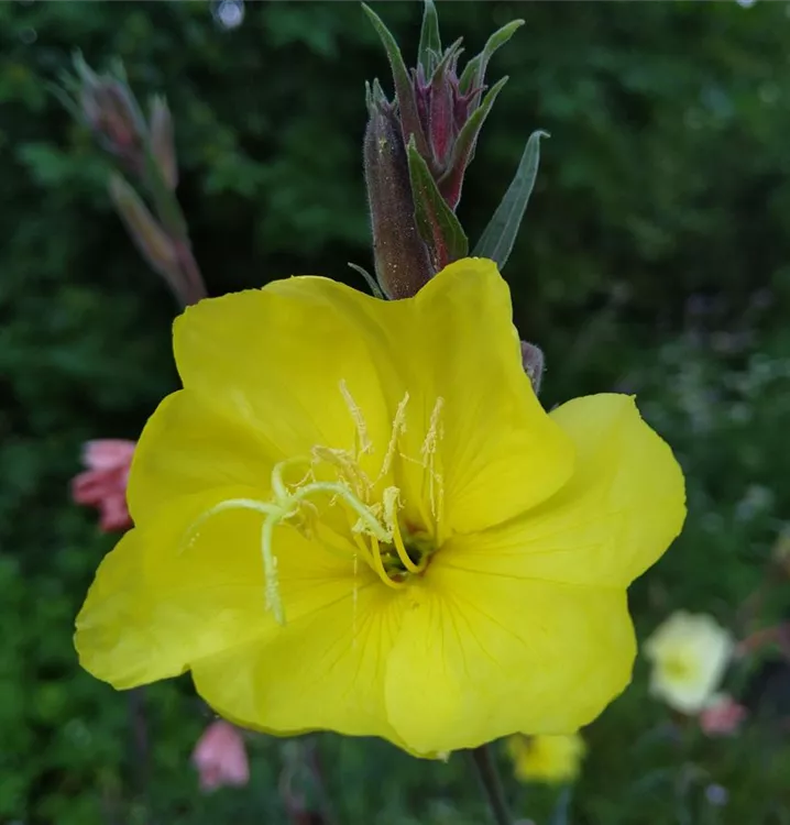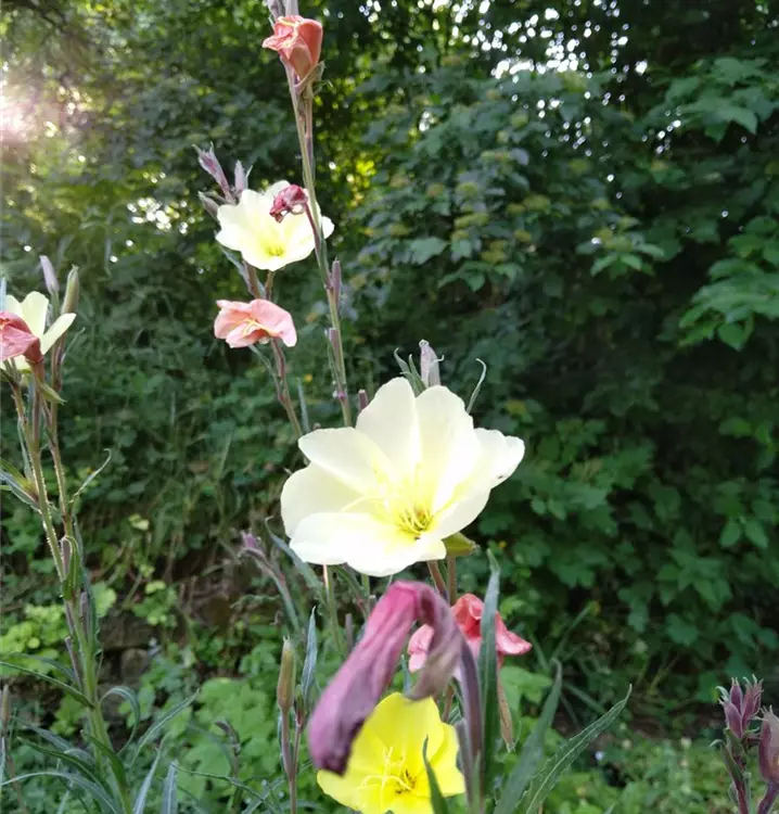 Macht ihrem Name alle Ehre: Die Duftende Nachtkerze verströmt vor allem in den Abend- und Nachtstunden ihren intensiven, süßen Duft und lockt damit vielerlei Nachtfalter in den Garten. Die einzelnen Blüten sind zwar recht kurzlebig, sie blühen jedoch nacheinander auf, so dass die Blütezeit mehrere Monate andauert. Beim Öffnen sind sie satt gelb. Im Verblühen färben sie sich rot. Die lebendigen, schalenförmigen Blüten stehen zahlreich in stark verzweigten Blütentrauben und bilden einen schönen Kontrast zum dunklen Laub und den rötlich überlaufenen Stängeln. Die Duftende Nachtkerze ist zweijährig, erhält sich aber an zusagendem Standort zuverlässig durch Selbstaussaat. Diese mittelhohe Nachtkerzenart ist äußerst genügsam und kaum anfällig für Schädlinge. Gute Begleitpflanzen im sonnigen Staudenbeet sind Origanum Laev.-Hybr. Aromatica (Blumen-Oregano) und Phlox divaricata Clouds of Perfume (Kanadische Garten-Flammenblume).