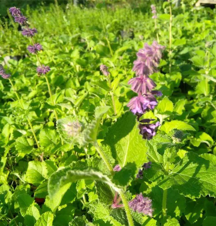 Aromatisch duftender Salbei: Auch der Quirlblütige Salbei kann, wie die meisten seiner Verwandten, in der Küche als Würzkraut verwendet werden. Er ist etwas weniger intensiv im Geschmack und gibt nur eine leichte, dezente Salbei-Note. Die vitale Wildstaude ist aber auch wertvoll als Zierde im Garten. Sie bildet schöne Horste aus aufrechten, bis in die Blütenstände beblätterten Stängeln. Ihr mattgrünes, etwas zerknittert wirkendes Laub ist breit herzförmig, mit gezähnten Blatträndern. Am Grund der Pflanze sind die einzelnen Blätter recht groß und werden nach oben hin immer kleiner. Wie es der Name vermuten lässt, sitzen die violetten Lippenblütchen in reichblütigen, quirligen Blütenständen zusammen. Die kugeligen Blütenquirle sitzen etagenartig übereinander und bilden einen herrlichen, von Bienen umschwirrten Gesamtblütenstand. Nach der Blüte ist der Quirlblütige Salbei ebenfalls noch dekorativ im Beet, besonders auch den Winter über. Er verwildert gerne, was man ihm bei lichten Gehölzen bedenkenlos erlauben kann. Schöne Begleiter sind hier Echinops sphaerocephalus Arctic Glow (Weiße Drüsige Kugeldistel) und Saponaria officinalis (Echtes Seifenkraut).