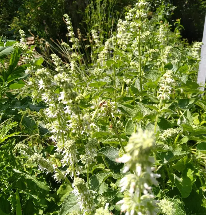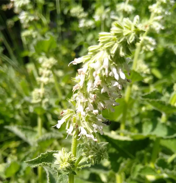 Verwildert gerne, wird aber nie lästig: Dieser Quirlblütige Salbei ist eine tolle Wildstaude für den Garten. Mit seinem natürlichen Charme wertet er z.B. Plätze vor lichten Gehölzen zu einem Tummelplatz für allerlei Insekten auf. Besonders Wildbienen besuchen gerne seine strahlend weißen, quirligen Blütenstände. Für einen schönen Aspekt im Winter kann man Verblühtes praktischerweise einfach im Beet stehen lassen. Die robuste Sorte hat mattgrünes, leicht runzeliges Laub mit gezähnten Blatträndern. Man kann, vor allem aus den jungen Blättern, einen wohlschmeckenden Tee zubereiten. Oder diesen aromatisch duftenden Salbei als mildes Würzkraut in der Küche verwenden. Die schönen, aufrechten Horste des Quirlblütigen Salbeis passen besonders gut zu Leonurus cardiaca (Herzgespann) und Campanula rapunculoides (Acker-Glockenblume).
