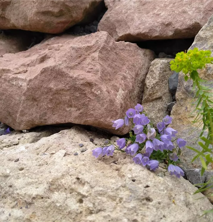 Freundliche, kleine Wildstaude: Mit ihren nickenden, blauen Glockenblüten, die zu mehreren in lockeren Trauben sitzen, ist diese kleine Staude ein Muss für jeden Stein- und Naturgarten. Ihre feinen, unterirdischen Ausläufer finden selbst in den kleinsten Ritzen und Fugen Halt. Auch im Topf oder Kübel gepflanzt, gedeiht der Winzling sehr gut. Ihre aufrechten Stängel tragen wenige lanzettliche Laubblättchen in sattem Grün. Die zahlreichen Grundblättchen sind rundlich und haben einen gesägten Rand. Sie sind auch zur Blütezeit noch vorhanden. Die Blüten der endständigen Trauben sind alle in die gleiche Richtung geneigt und locken allerlei Insekten und Wildbienen an. Lässt man die Blütenstände nach der Blüte stehen, vermehrt sich diese anspruchslose Glockenblume zuverlässig durch Selbstaussaat und bildet bald hübsche, polsterartige Kolonien. Knipst man Verblühtes aus, fördert man einen zweiten Flor. Man kann die niedliche Zwerg-Glockenblume gut kombinieren mit Potentilla neumanniana (Frühlings-Fingerkraut), Gypsophila fastigiata (Ebensträußiges Gipskraut) und Geranium sanguineum var. Striatum (Blut-Storchschnabel).