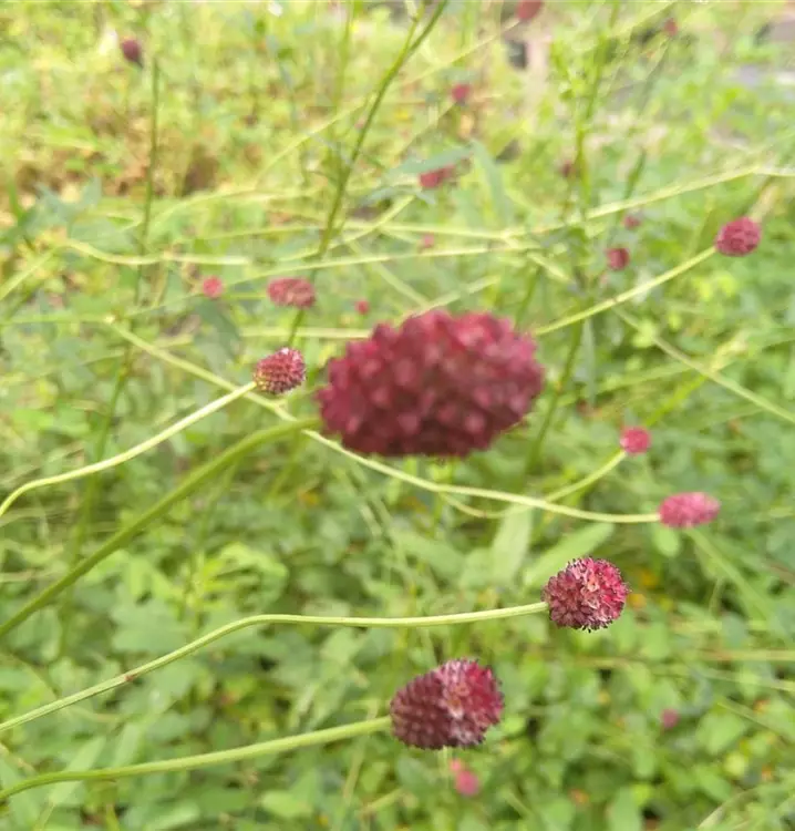 Tolle Bereicherung für naturnahe Beete: Mit seinem schlanken Wuchs passt der Große Wiesenknopf hier gut zwischen Geranium sylvaticum (Wald-Storchschnabel) und Anthriscus sylvestris (Gewöhnlicher Wiesen-Kerbel). Seine aufrechten Blütenköpfe haben eine herrliche, tief weinrote Farbe. Sie schweben auf ihren dünnen, verzweigten Stängeln zwischen den anderen Blüten und werden besonders gerne von Schmetterlingen besucht. Für zahlreiche Schmetterlingsraupen ist der Große Wiesenknopf zudem eine wichtige Futterpflanze. Das Laub der vitalen Wildstaude ist gefiedert und wächst rosettig am Grund der Pflanze. Die einzelnen Fiederblättchen sind lanzettlich und haben einen scharf gesägten Blattrand. Seine aufrechten Stängel sind nur spärlich belaubt. Der Große Wiesenknopf enthält blutstillende und antiseptisch wirkende Inhaltsstoffe, die lindernd wirken bei Durchfallerkrankungen oder Entzündungen in Mund und Rachen. Für die Heilkunde verwendet man die Wurzel und das Kraut und stellt daraus Tees oder alkoholische Tinkturen her. Als Küchenkraut kommt der Große Wiesenknopf seltener zum Einsatz, weil sein Laub recht zäh ist. Hier nutzt man besser seinen Bruder, den Kleinen Wiesenknopf (Sanguisorba minor).