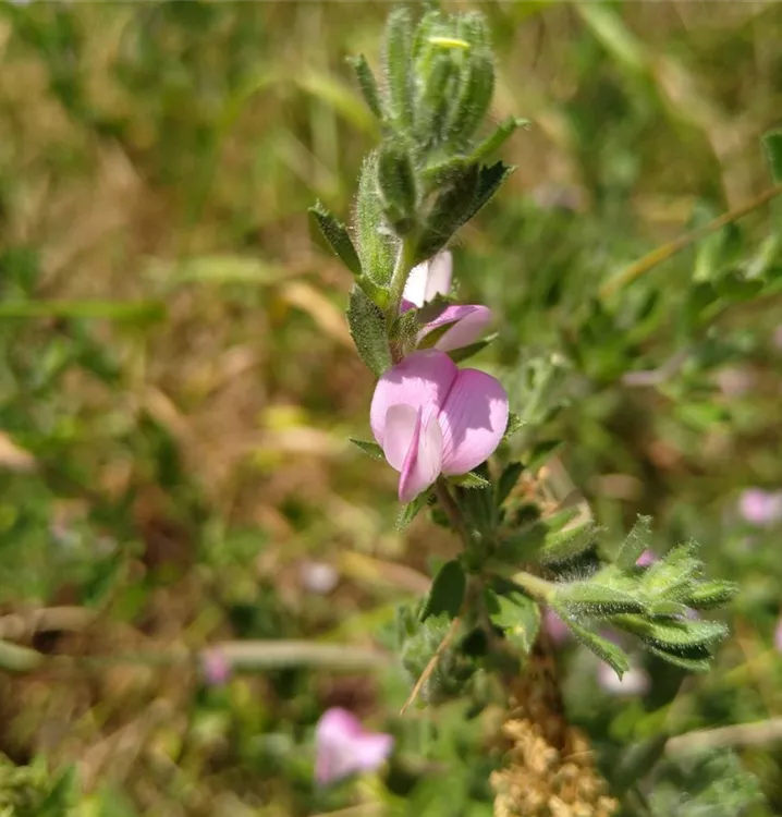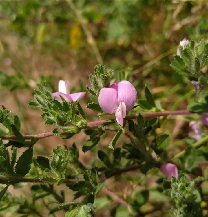 Wehrhafte Staude für sonnige Lagen: Die Dornige Hauhechel wächst aufrecht verzweigt und verholzt am Grunde leicht. Ihre Stängel sind apart dunkelrot gefärbt und mit langen, pieksenden Sprossdornen bewehrt. Die rötliche Farbe der Stängel bildet einen schönen Kontrast gut zu den graugrünen, mehrfach gefiederten Blättern. Diese haben einen spitz gesägten Blattrand, sind reich an ätherischen Ölen und riechen sehr intensiv. Die zahlreich erscheinenden, rosa Schmetterlingsblüten der robusten Wildstaude sitzen, jeweils zu dritt, an den zahlreichen Seitentrieben, jeweils in den Blattachseln. Die dornige Hauhechel hat als Heilpflanze eine lange Tradition. Man erntet die Wurzel und verwendet sie frisch oder getrocknet. Der Wurzel wird eine harntreibende Wirkung nachgesagt, die positiv bei Blasenentzündungen wirkt und vorbeugend gegen Nierensteine. Auch bei Gicht und Rheuma kam sie zum Einsatz. Gute Begleitpflanzen sind Anthemis tinctoria (Färber-Hundskamille) und Salvia nemorosa (Steppen-Salbei).