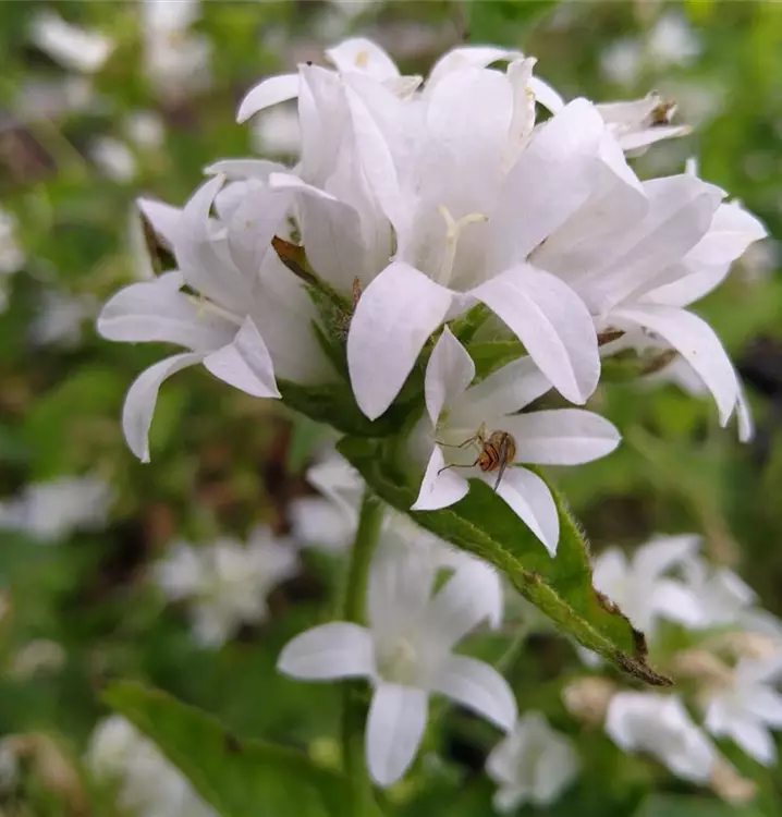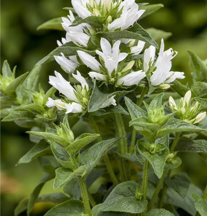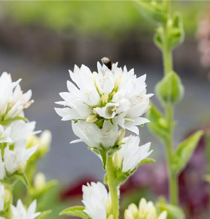 Freundliche, mittelhohe Staude, die in keinem Bauerngarten fehlen darf: Die hübschen, bei dieser Sorte weißen Blütenstände bereichern den Sommer über sonnige bis halbschattige Staudenbeete. Und auch vor Hecken und Sträuchern sind sie wirkungsvolles Gestaltungselement. Man kann die Knäuel-Glockenblume auch vor Trockenmauern und in den Steingarten pflanzen. Ihre kleinen, glockenartigen Blüten sitzen in den oberen Blattachseln und drängen sich zu mehreren in einem endständigen, kugeligen Blütenknäuel. Daher hat sie auch ihren Namen. Die dekorativen Blüten locken allerlei Bienen- und Insektenarten. Sie werden getragen von kantigen, aufrechten Stängeln, die besetzt sind mit lanzettlichen, behaarten Blättern mit gesägtem Blattrand. Das mattgrüne Laub der Knäuel-Glockenblume wächst zu buschigen und doch anmutigen Horsten heran, die sich wunderbar kombinieren lassen mit anderen Wildstauden wie z.B. Aster amellus (Kalk-Aster), Eryngium planum (Flachblättriger Mannstreu) und Scabiosa ochroleuca (Gelbe Skabiose). Und auch drinnen verbreitet diese Glockenblume ihren heiteren Charme, hält sie sich doch gut in der Vase. Diese Sorte ist recht wüchsig. Wenn man sie lässt, vermehrt sie sich über Ausläufer zu herrlichen, üppig blühenden Beständen. Sie gedeiht aber auch gut im Kübel.