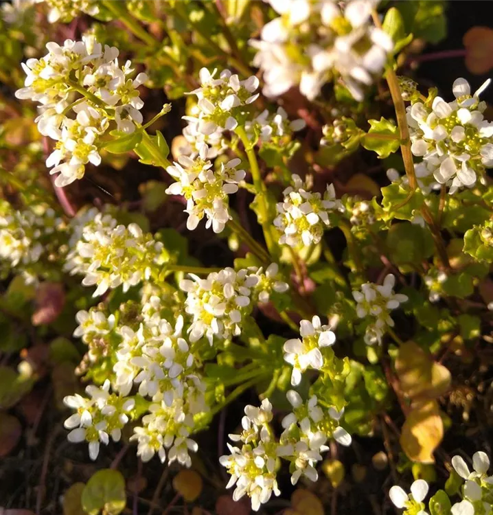 Leckeres Küchenkraut, das zu Unrecht in Vergessenheit geraten ist: Die Blätter des Löffelkrauts haben ein kresseartiges Aroma und können z.B. an Salate, Kräuterquark und -butter gegeben werden. Man kann sie getrocknet oder frisch verwenden. Letzteres sogar im Winter. Die Wikinger haben Löffelkraut übrigens, eingelegt in Salz, auf ihren Seereisen mitgeführt – als Mittel gegen Skorbut. Und nicht nur das. Der botanische Name „officinalis“ deutet darauf hin, dass es früher quasi zur Grundausstattung jeder Apotheke gehörte. Löffelkraut wurde eingesetzt gegen Gicht und Rheuma (als Tee), galt als blutstillend und man vertrieb mit ihm die Frühjahrsmüdigkeit und andere Erschöpfungszustände. Seine grundständigen, nierenförmigen Laubblätter wachsen rosettig. Aus ihrer Mitte wächst ein aufrechter Stängel, der mit herzförmigen Blättern besetzt ist. Die adretten weißen Kreuzblüten duften angenehm und stehen zu mehreren in kleinen, kugeligen Blütentrauben zusammen. Das passt im Kräuterbeet gut zusammen mit Apium graveolens (Schnitt-Sellerie), Carum carvi (Wiesen-Kümmel) und Allium tuberosum (Schnitt-Knoblauch).