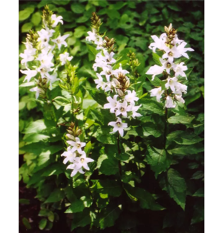 Sooo viele Blüten: Die Breitblättrige Glockenblume schmückt sich im Sommer mit einem üppigen Flor aus weißen Glöckchen. Die großen, nickenden Blüten sitzen in den oberen Blattachseln sowie endständig auf locker verzweigten Stängeln und lassen wunderbare, durchblätterte Blütentrauben entstehen. Ihr gesunder, robuster Charme passt gut in naturnahe Pflanzungen. Die weithin strahlenden Blüten dieser Glockenblume sind alle mehr oder weniger in die gleiche Richtung geneigt und ermöglichen, zusammen mit Aconitum napellus (Blauer Eisenhut), Aquilegia atrata (Schwarzviolette Akelei) und Osmunda regalis (Königsfarn), variantenreiche Pflanzungen. Und auch schon vor der Blüte ist die Breitblättrige Glockenblume mit ihrem horstigen Wuchs wichtiges Gestaltungselement im Beet. Die Stängelblätter sind oval-lanzettlich und sitzen etagenartig übereinander an den aufrechten, stabilen und manchmal leicht gerillten Stängeln. Die Grundblätter sind eher langgestreckt-eiförmig. Die Elternart dieser Sorte kommt wild in den Alpen, Sibirien und auch im Himalaja vor. Entsprechend robust und gesund sind die Breitblättrigen Glockenblumen. Man findet sie wild in der Nähe von Bächen und in lichten Laubmischwäldern. Dementsprechend sollte man auch ihren Standort im Garten wählen. An sehr sonnigen Standorten muss man ausreichend wässern. Ausläufer bildet diese Sorte nicht.