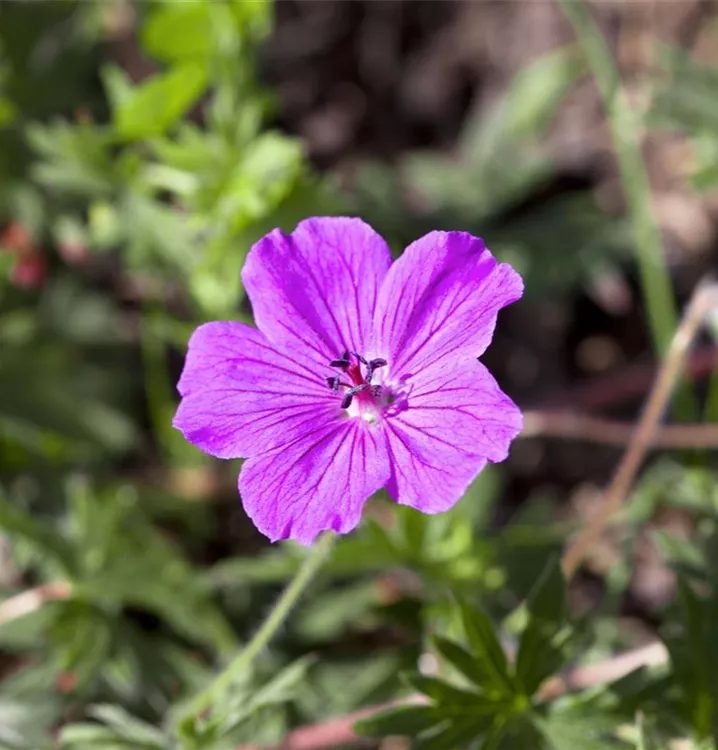 Und noch ein Storchschnabel: Der Blutrote Storchschnabel macht dünne, niederliegende Triebe, die sich sparrig verzweigen. Mit der Zeit entstehen so ansehnliche Polster. Die Laubblätter sind tief eingeschnitten. Im Herbst haben sie eine dekorative rote Färbung. Die purpurfarbenen, schalenförmig ausgebreiteten Blütchen erscheinen ausdauernd den ganzen Sommer über. Für einen Storchschnabel sind sie recht groß. Das Laub ist mehrfach und sehr tief gelappt. Es duftet intensiv. Der Blutrote Storchschnabel ist ideal zur Begrünung von Gebüschsäumen und zum Verwildern an Hanglagen geeignet. Er kann auch zur extensiven Dachbegrünung (ab 25 cm Substrathöhe) eingesetzt werden. Aber auch in naturnahe Beete und Rabatten passt er mit seiner mittleren Höhe und dem buschige Wuchs sehr gut, z.B. zusammen mit Euphorbia cyparissias (Zypressen-Wolfsmilch) und Lithospermum purpurocaeruleum (Blauroter Steinsame).