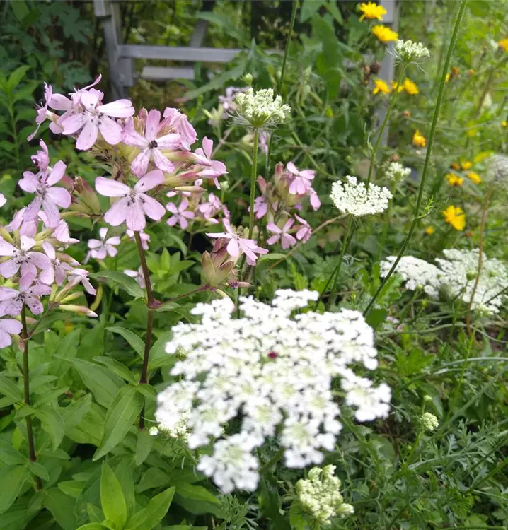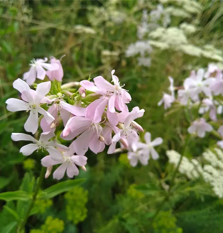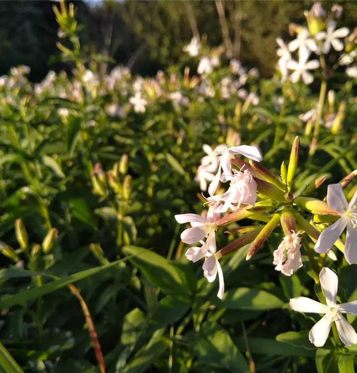 Wurde früher als Waschmittel genutzt: Und das noch bis Anfang des vorigen Jahrhunderts. Man verwendet dazu angeschnittene Stücke der Wurzel. Noch heute bedienen sich Restauratoren einer milden Lauge aus Echtem Seifenkraut, um historische Möbel und Stoffe schonend zu reinigen. Zubereitungen aus der Wurzel werden auch für heilkundliche Zwecke, z.B. gegen Bronchitis benutzt. Die hübsche Staude bildete zahlreiche Stängel, die aufrecht und unverzweigt wachsen. Sie sind weich behaart und locker belaubt mit langen, lanzettlichen Blättern. Die zierlichen, leicht duftenden Blüten sind fünfzählig, mit weit zurückgebogenen Blütenblättern. Ihr Duft nimmt in den Abendstunden zu und lockt damit vielerlei Nachtfalter in den Garten. Aber auch Wildbienen besuchen sie gerne. Mit unterirdischen Ausläufern breitet sich das Echte Seifenkraut im Beet aus, wird aber nie lästig. Man kann es gut kombinieren mit Linaria vulgaris (Gewöhnliches Leinkraut) und Campanula rapunculoides (Acker-Glockenblume).