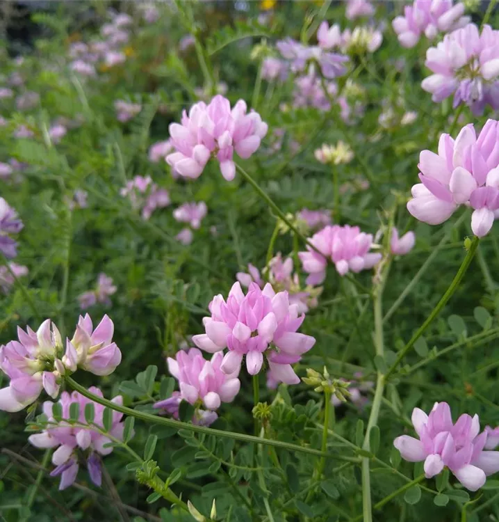 Guter Flächendecker: Die Bunte Kronwicke ist bestens geeignet zur flächigen Bepflanzung von hellen Gebüsch- bzw. Heckensäumen und kommt auch mit steinigen Böden gut zurecht. Sie wurzelt bis zu 1 m tief in den Boden und breitet sich an Standorten, an denen sie sich wohlfühlt, zügig aus. Besondere Pflege braucht sie nicht. Die Bunte Kronwicke düngt sich sogar selbst, in dem sie mit Hilfe von im Boden lebenden Bakterien den Stickstoff aus der Luft bindet. Aufgrund des ausgeprägten Ausbreitungsdrangs sollte man ihr ebenso starkwüchsige Begleiter, wie z.B. Linaria vulgaris (Gewöhnliches Leinkraut), Campanula rapunculoides (Acker-Glockenblume) und Rumex acetosella (Kleiner Sauerampfer) zur Seite pflanzen. Das frischgrüne Laub der Bunten Kronwicke ist filigraner gefiedert als das anderer Kronwicken. Die einzelnen Fiederblättchen sind oval und sitzen kurzgestielt an den aufrecht bis niederliegend wachsenden, kantigen Stängeln. Die violetten Blütchen sitzen zu mehreren in adretten, kugeligen Dolden im oberen Teil der sich verzweigenden Stängel. Nach der Blüte bilden sich kantige, hakig gebogene Hülsenfrüchte. Auch sehr dekorativ.