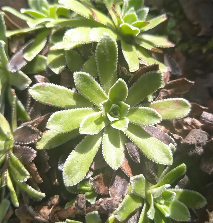 An extreme Standortbedingungen angepasst: Weder große Trockenheit noch klirrende Kälte können dem robusten Trauben-Steinbrech etwas anhaben. Er wächst, dicht an den Boden gedrückt in kompakten, halbkugeligen Polstern. Sein eiförmiges Laub ist fleischig und immergrün. Es scheidet am Rand Kalk aus, was den Blättern eine ungewöhnliche, weiße Bereifung verleiht. Zur Blütezeit erheben sich auf einem dünnen, rötlich überlaufenen Stängel rispige Blütenstände aus kleinen, weißen Schalenblüten. Sie sind flach ausgebreitet und locken vielerlei Insekten in den Garten. Der Trauben-Steinbrech passt besonders gut in den Steingarten, wo man ihn z.B. mit Sempervivum arachnoideum (Spinnweben-Hauswurz) zusammen pflanzen kann. Auch zur Begrünung von Trockenmauern oder als dekorative Kübelbepflanzung kann man ihn einsetzen.