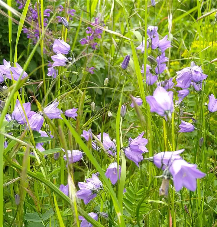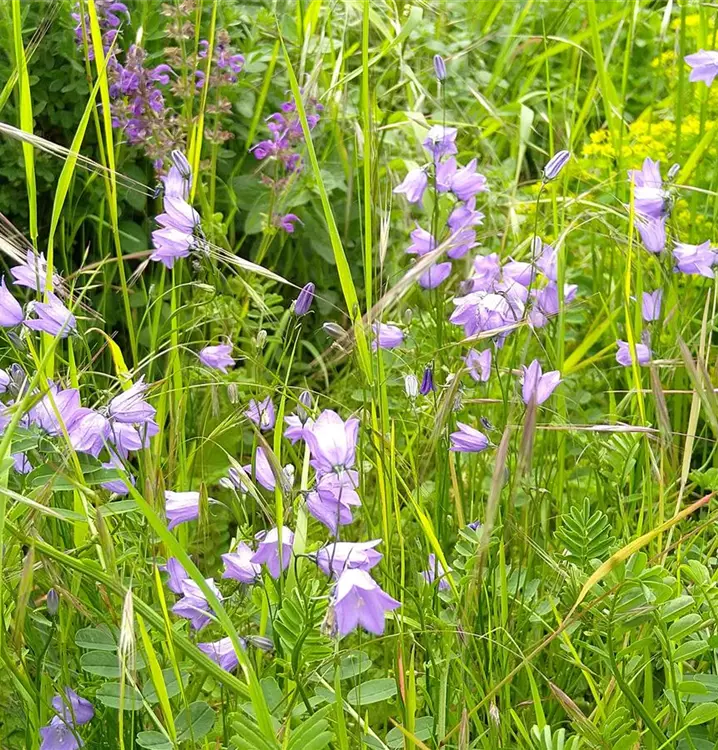 Anmutige kleine Wildstaude: Die heimische Rundblättrige Glockenblume hat nickende, blaue Glockenblüten, die gerne von Wildbienenarten besucht werden. Sie sitzen in einer lockeren, endständigen Traube und sind alle mehr oder weniger in die gleiche Richtung geneigt. Man kann sie essen und z.B. Sommersalate farbenfroh mit ihnen dekorieren. Die grünen Teile, Staubgefäße und Griffel entfernt man vor dem Verzehr. Besonders gut schmecken auch die jungen Blätter und Triebe der Rundblättrige Glockenblume. Man kann die rundlichen Grundblätter (Name!) und die lanzettlichen Stängelblätter zum Würzen von Blattsalaten wie Rucola oder Feldsalat benutzen. Sie sitzen locker verteilt an dünnen, aufrechten Stängeln. Diese sehr wüchsige Glockenblume verbreitet sich schnell durch Ausläufer und bildet bald dichte, überschwänglich blühende Bestände. Wirkungsvolle und abwechslungsreiche Wildstaudenpflanzungen lassen sich zusammen mit Calluna vulgaris (Besenheide), Hieracium pilosella (Kleines Habichtskraut) und Festuca ovina (Echter Schaf-Schwingel) gestalten. Auch im Steingarten und auf Trockenmauern gepflanzt, gedeiht diese zierliche Glockenblume sehr gut.
