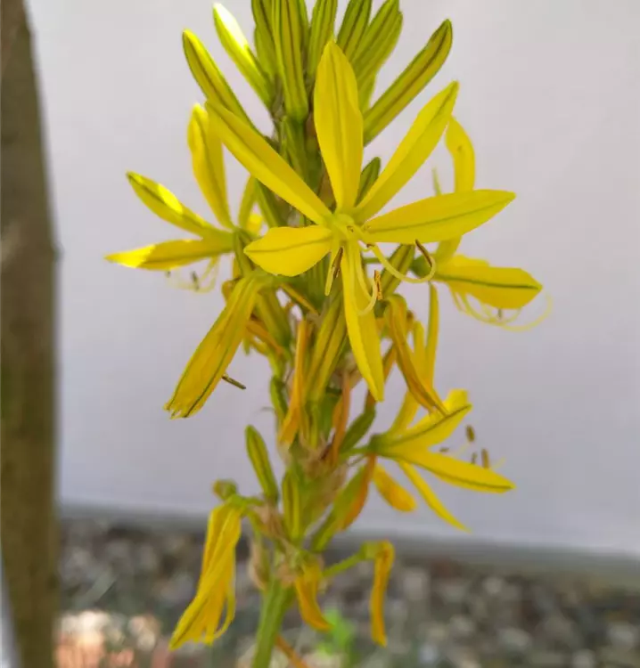Beliebte Gartenstaude mit duftenden Blütentrauben und schöner Laubfärbung: Die rund um das Mittelmeer beheimatete Staude ist auch unter dem Namen Gelber Affodill oder Königszepter bekannt. Sie eignet sich gut für mediterran gestaltete Gärten. Aber auch in steppenartigen Pflanzungen und Kiesbeeten ist sie ein schöner Blickfang. In sonnigen Rabatten und Wildstaudenbeeten gepflanzt, überragen ihre üppigen Blütentrauben den Weißen Echten Lavendel (Lavandula angustifolia Alba), Flachblättrigen Mannstreu (Eryngium planum) und das Alpen-Raugras (Stipa calamagrostis), mit denen man sie gut kombinieren kann. Die Junkerlilie bildet buschige Horste aus grasähnlichen, blau-grünen Blättern. Ihre aufrechten, dicht beblätterten Stängel sind unverzweigt und tragen die auffälligen Blütenstände, die dem Namen Königszepter alle Ehre machen. In üppiger Traube sitzen die großen, sternförmigen Lilienblüten dicht an dicht, durchsetzt mit wenigen Laubblättern. Die nach der Blüte erscheinenden beerenartigen Früchte sitzen direkt am Stängel und sind bis in den Winter hinein schmückendes Element im Beet. Staunässe vermeiden.