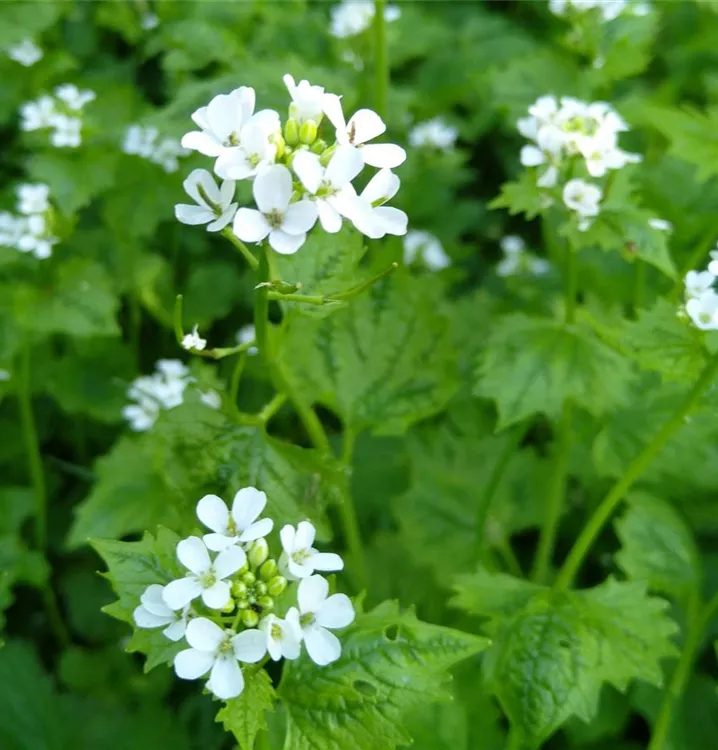 Anspruchsloses Küchenkraut mit pfeffrig-knoblauchartigem Geschmack: Die Knoblauchsrauke wächst wild an Wegrändern, in Gebüschen und lichten Wäldern. Sie lässt sich leicht im Garten an etwas feuchteren Stellen ansiedeln. Hier samt sie sich jedes Jahr aus und bildet bald dichte Bestände für eine lohnende Ernte.