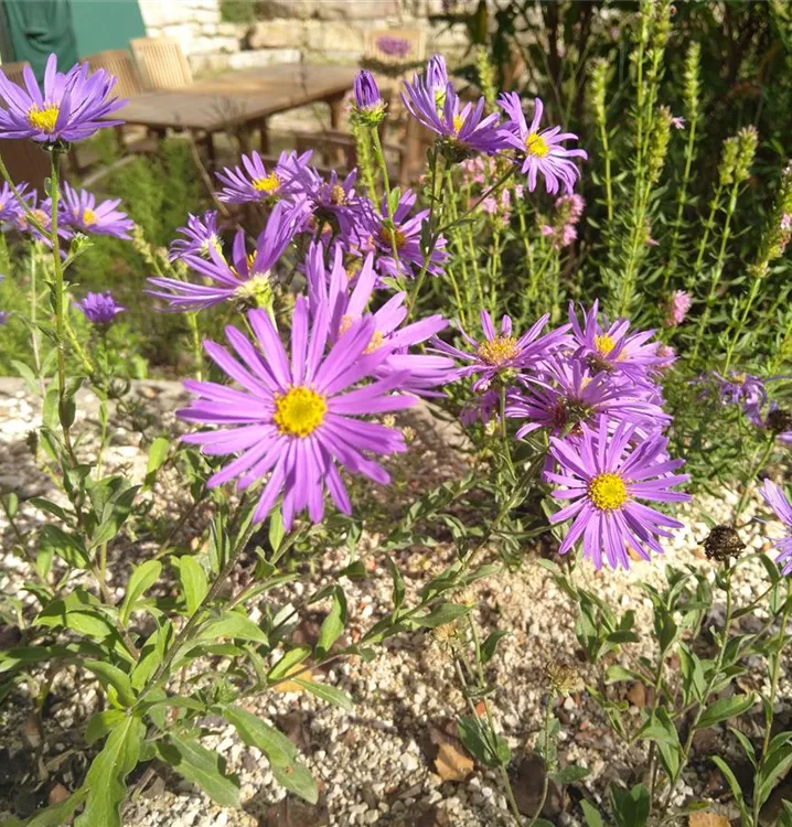 Blüht sehr lange und üppig: Die Kalk-Aster kommt wild in Mittel- und Osteuropa sowie Weißrussland und der Türkei vor. Ihre dunklen, aufrechten Stängel kontrastieren schön mit den mattgrünen, breit lanzettlichen Laubblättern. Die horstig wachsende Pflanze ist rau behaart und verholzt am Grunde leicht. Am oberen Ende des verzweigten Stängels erblühen in einer lockeren Traube mehrere blaue Korbblüten mit gelber Mitte. Die Blütenblätter der Kalk-Aster sind etwas schmaler und feiner als bei anderen Astern. Wie die meisten alpinen Pflanzen fühlt sich die locker-buschig wachsende Staude besonders an sonnigen Standorten wohl. Im Vordergrund von Frühsommerbeeten kommt sie gut zur Geltung, passt aber auch als schöner blauer Akzent in Heide- und Steingärten. Abwechslungsreiche Pflanzungen lassen sich mit Begleitpflanzen wie bspw. Schnee-Heide (Erica carnea), Echter Schaf-Schwingel (Festuca ovina), Bergminze (Calamintha nepeta Weißer Riese) und Gewöhnl. Golddistel (Carlina vulgaris) gestalten. Die Kalk-Aster wird fleißig von Fliegen, Tagfaltern und Wildbienen besucht. Distelfink, Feldsperling und Dompfaff lieben ihre Samen.