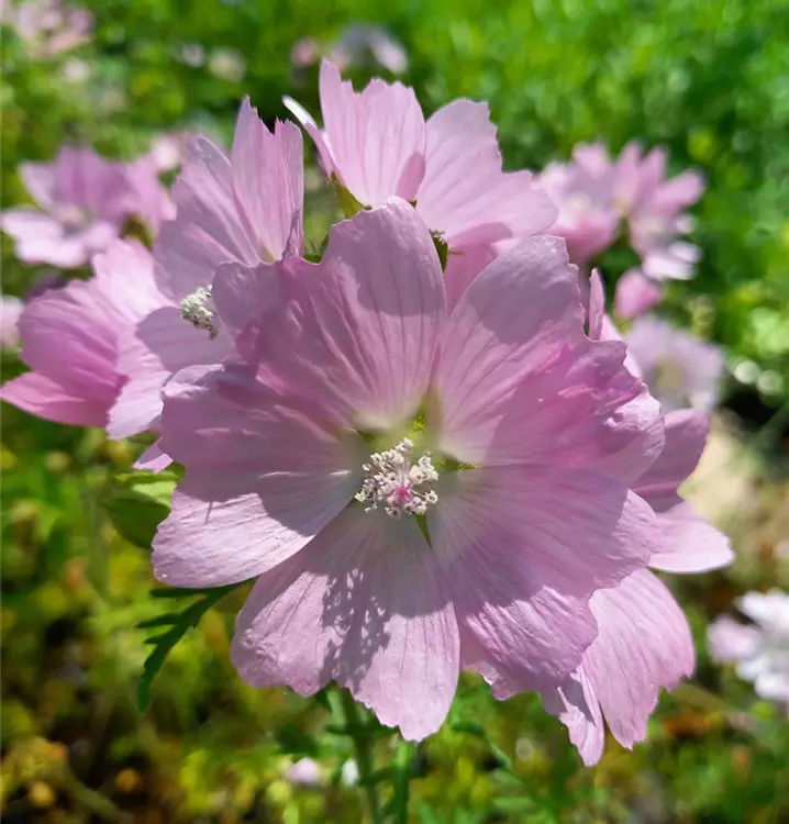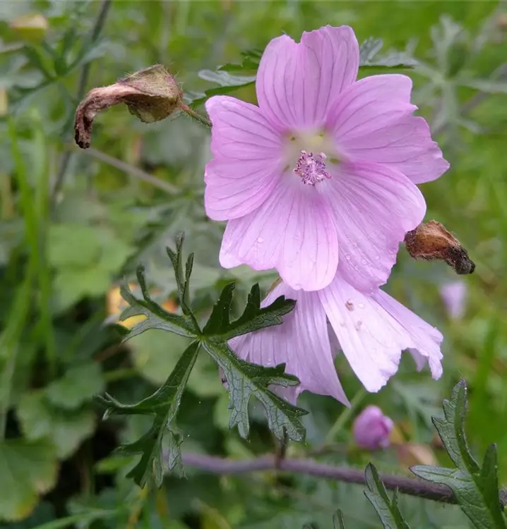 Sie duftet nach Moschus: Daher auch der Name. Die duftenden Blüten der Moschus-Malve findet man häufig in Teemischungen. Man kann sie aber auch als sommerliche Dekoration für Salate verwenden. Die typischen Malvenblüten erscheinen in den Blattachseln und sitzen gehäuft am oberen Stängelende zusammen. Neben den Blüten können auch andere Pflanzenteile in der Küche verwendet werden. Die Stängel dünstet man bspw. wie Spargel. Unreife Samenkapseln kann man einlegen und wie Kapern verwenden. Und auch die tief geteilten Laubblätter finden Verwendung, z.B. im Gemüse und in Suppen. Wie andere Malven auch, ist die Moschus-Malve heilkräftig und wirkt positiv bei Erkältungen und Bronchitis. Und natürlich ist die buschig wachsende Staude eine Zierde im Garten. Im Wildstaudenbeet kann man sie z.B. mit Salvia nemorosa (Steppen-Salbei) und Silene vulgaris (Taubenkropf-Leimkraut) zu natürlich wirkenden Pflanzungen kombinieren. Gute Bienenweide. Klassische Bauerngartenstaude.
