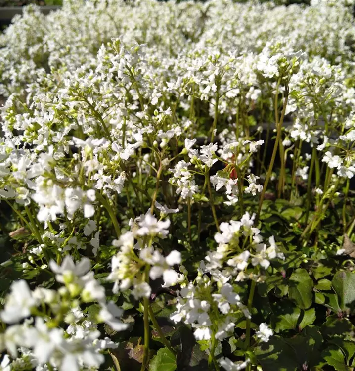 Zierliche Waldstaude, die am besten im Schutz von Gehölzen gedeiht: Das Kleeblättr. Schaumkraut zeichnet sich durch eine besonders gute Schattenverträglichkeit aus. Es vermehrt sich über Ausläufer und bildet langsam dichte Bestände, die besonders gut in den Naturgarten passen. So kann man die bezaubernde kleine Staude zur Gestaltung von schattigen Staudenbeeten, kombiniert mit Arum italicum (Italienischer Aronstab), Lysimachia nemorum (Hain-Gilbweiderich) und Asarum europaeum (Haselwurz) einsetzen. Das wintergrüne Laub des Kleeblättr. Schaumkrauts ist dreigeteilt und erinnert, wie der Name schon vermuten lässt, mit seinen rundlich geformten Blattabschnitten an Klee. Es bildet am Grund der Pflanze eine undeutliche Rosette, aus deren Mitte drahtige, aufrechte Stängel wachsen. Die trichterförmigen, weißen Blütchen bilden lockere Trugdolden, die auf manchmal rötlich überhauchten Stielen über dem dunklen Laubpolstern schweben. Sie duften leicht und verfärben sich im Verblühen Rosa.