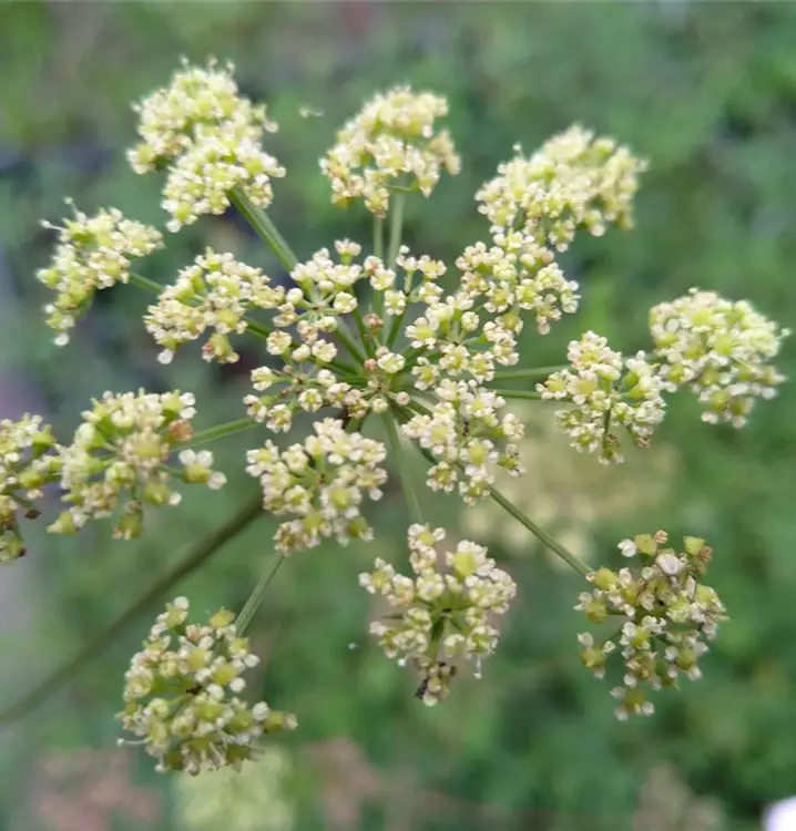 Wirkungsvolle Staude für Gehölzränder: Der Elsässer Haarstrang ist ein hoch wachsender Doldenblütler und kommt in der Natur oft bei Gebüschen und Hecken vor. Entsprechend kann man ihn im Garten gut in die Nähe von Gehölzen pflanzen. Seine strahligen weißen, manchmal auch cremefarbenen Blütenstände werden gerne von kurzrüsseligen Insekten besucht, die vom leicht zu erreichenden Nektar naschen. Der aufrechte, zumeist violett gefärbte Stängel ist stabil und wächst astig verzweigt. Das Laub der stattlichen Pflanze ist mehrfach fein gefiedert und gibt ihr, trotz ihrer Größe, ein leichtes, luftiges Aussehen. Man kann den Elsässer Haarstrang auch gut im Staudenbeet pflanzen. Im Hintergrund platziert und mit Geranium phaeum (Brauner Storchschnabel) und Helleborus foetidus (Stinkende Nieswurz) kombiniert ergeben sich so sehr natürlich anmutende Beete.