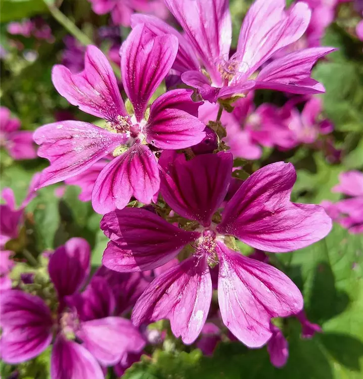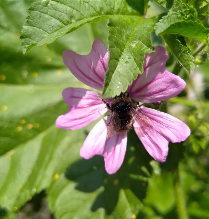 Schöne wüchsige Malve für den Naturgarten: Diese herrliche Wilde Malve mit purpurvioletten, dunkel gezeichneten Blüten passt mit ihrem natürlichem Charme gut in Wildstaudenbeete, z.B. zusammen mit Oenothera biennis (Gewöhnliche Nachtkerze) und Dipsacus fullonum (Wilde Karde). Ihre aufrechten Stängel sind unverzweigt und dicht belaubt mit rundlichen, grünen Blättern. Kleingehackt, kann man die jungen, mineralstoffreichen Blätter in Wildkräutersalaten verwenden. Die gelben oder hellbraunen, runzligen Früchte können, in Essig eingelegt, als Kapernersatz dienen. Die Blüten erscheinen in den Blattachseln und am oberen Stängelende. Hier sitzen sie zu mehreren gehäuft zusammen. Die Wilde Malve gedeiht auch in ausreichend großem Kübel und ist eine Bereicherung für jeden Topfgarten. Malventee (aus den Blüten) hilft bei Erkältungen und Magen-Darm-Problemen. Kompressen aus den Blättern (zu Brei verarbeitet) wirken bei Hautproblemen und Insektenstichen. Klassische Bauerngartenstaude. Wichtige Futterpflanze für Schmetterlinge und Wildbienen.