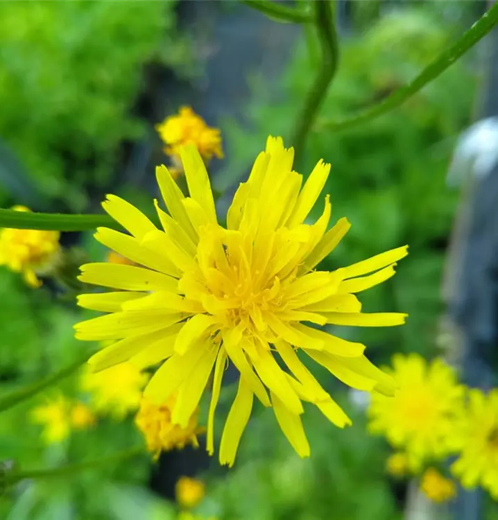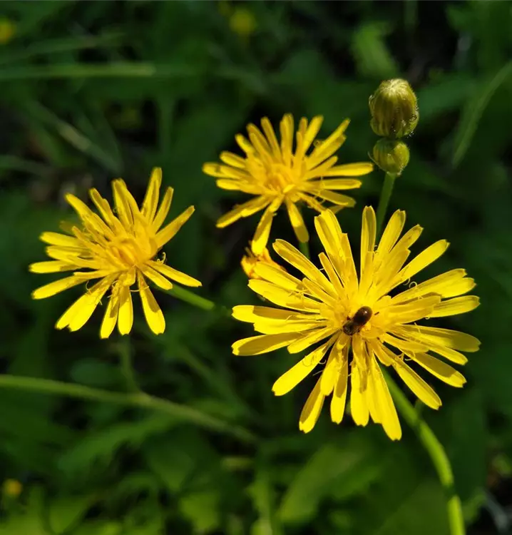 Freundlicher, gelb blühender Korbblütler: Der Wiesen-Pippau kommt in der Natur vor allem auf Fettwiesen vor, liebt also sonnige, nährstoffreiche Plätze. Entsprechend sollte man seinen Standort im Garten wählen. Die aufrechten, astig verzweigten Stängel tragen am oberen Ende kleine Blütenkörbchen, die an Löwenzahn erinnern. Bestäubt wird der Wiesen-Pippau vor allem von Bienen. Seine kleinen, frischgrünen Laubblätter sind lanzettlich bis elliptisch und spärlich verteilt im unteren Teil der Pflanze. Das rosettig wachsende Laub direkt über dem Boden ist eigentümlich federartig eingeschnitten. Eine Besonderheit übrigens, die ihn von vielen anderen, auf den ersten Blick ähnlich aussehenden Korbblütlern, unterscheidet. Mit seiner dürren Gestalt fügt sich der Wiesen-Pippau im Beet unkompliziert ein zwischen Centaurea jacea (Wiesen-Flockenblume), Leucanthemum ircutianum (Fettwiesen-Margerite) und Sanguisorba officinalis (Großer Wiesenknopf).