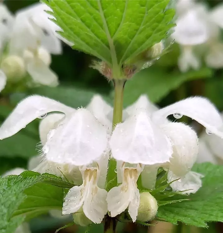 Taubnesselsalat mit Ei: 30 g Taubnesselblüten waschen und in feine Streifen schneiden. 2 weichgekochte Eier in Scheiben und 50 g feinblättrig geschnittene Champignons. Eine Zwiebel würfeln, alles miteinander ver-mischen, mit Essig, Öl, Kräutern und Gewürzen abschmecken und mit den Blüten von Gänseblümchen und Taubnesseln garnieren.