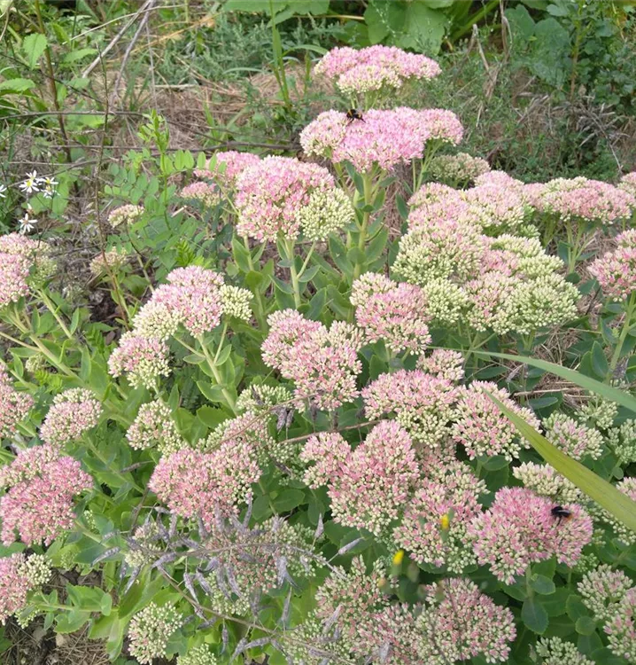 Sehr markant im Beet: Diese prachtvolle Purpur-Fetthenne hat tief rote, aufrechte Stängel, die locker belaubt sind. Ihre eiförmigen, fleischigen Blätter sind bräunlich-grün, was einen tollen Kontrast zu den roten Stängeln ergibt. Das obere Stängelende krönt sich mit flachen, trugdoldigen Blütenständen aus hellrosa Blütensternen. Ein Traum. Ein garantiert Schmetterlings- und Bienenumschwirrter Traum. Die kompakten, aufrechten Horste, die mit jedem Jahr üppiger werden, passen in sonnigen Beeten und Rabatten gut zu Aster pyrenaicus Lutetia (Pyrenäen-Aster) und Stipa calamagrostis (Silber-Ährengras). Lässt man die verblühten Triebe stehen, sorgt man für einen schönen Aspekt im winterlichen Beet. Junge Blättchen haben übrigens einen säuerlich-würzigen Geschmack und können in kleinen Mengen zu Salaten, Gemüsegerichten oder -säften gegeben werden. Diese Sorte gedeiht auch gut im Kübel. Gute Schnittblume. Gute Schmetterlings- und Bienenweide.