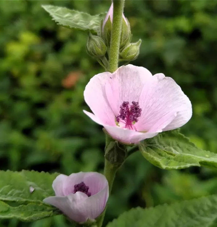 Heilkräftige Zierde im Kräutergarten: Die positiven Effekte des Echten Eibisch bei Husten, Bronchitis und anderen Atemwegserkrankungen sind in der Volksheilkunde lange bekannt. Er wirkt auch lindernd bei Magen- und Darmstörungen. Schon früh fand er daher Eingang in die alten Bauern- und Klostergärten. Seine samtigen, gelappten Blätter sitzen an stabilen, aufrechten Stängeln und bilden stattliche Horste. Junge Blätter und Triebspitzen kann man roh in bunte Salate geben. Frisch gequetschte Blätter, auf Insektenstiche aufgelegt, wirken abschwellend. Die malvenartigen, blassrosa Blüten bereichern als wertvolle Futterquelle für hochspezialisierte Wildbienenarten jeden Naturgarten. Sie sitzen in Trauben im oberen Drittel des Stängels und lassen sich gut kombinieren mit Wiesen-Teufelsabbiss (Succisa pratensis ssp. pratensis), Kuckucksblume (Silene flos-cuculi White Robin) und Gefleckte Taubnessel (Lamium maculatum).