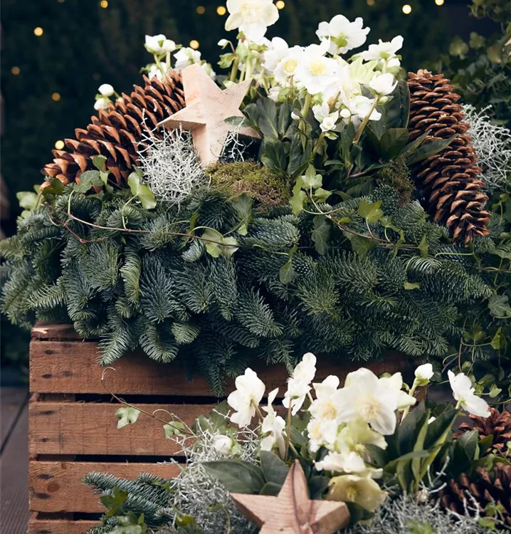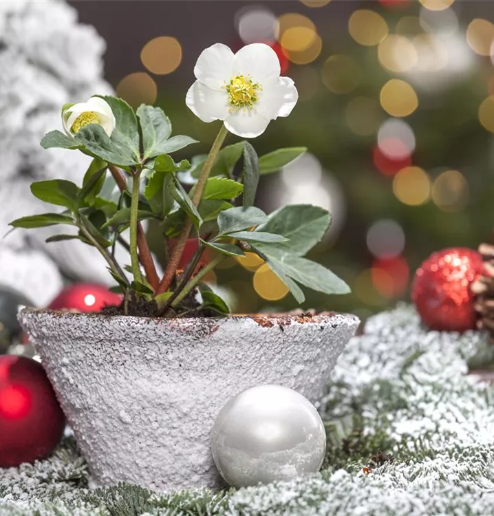 Auffallend große, weißen Blüten: Sie stehen endständig auf locker verzweigten, fleischigen Stängeln und erscheinen manchmal schon im Winter. Zuweilen sitzen die Blüten auch zu zweit oder zu dritt zusammen. Ihre großen, strahlenden Blüten machen die Christrose zu einem wertvollen Winterblüher im Garten. Auch das wintergrüne Laub ist sehr ausdrucksstark im Beet. Die dunkelgrünen, derben Blätter sind mehrfach tief bis an den Blattgrund geteilt. Die einzelnen Blattabschnitte sind umgekehrt lanzettlich und an den Blatträndern schwach gesägt. Man kann die Christrose auch bei lichten Gehölzrändern pflanzen, was ihrem Naturstandort in den europäischen Mischwäldern nahekommt. Lässt man sie ungestört wachsen, entstehen so bald stattliche Bestände. Geriebene Pflanzenteile reizen übrigens zum Niesen, daher der Name „Nieswurz“. Gedeiht auch im Kübel. Gute Schnittblume.