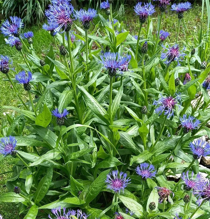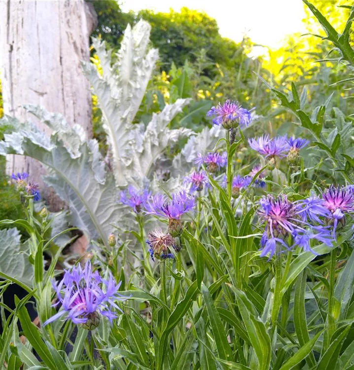 Herrliche Wildstaude mit zweifarbigen Blüten: Die Berg-Flockenblume ähnelt sehr der Kornblume, hat aber farbintensivere und größere Blüten. Ihre filigranen, radförmigen Körbchenblüten bestehen aus blauen, fransigen Zungenblüten und blau-violetten Röhrenblüten in der Blütenmitte. Man verwendet sie u.a. als Beigabe in Hustenteemischungen. Die dekorativen Blüten sitzen endständig und zumeist einzeln auf einem aufrechten Stängel. Mit ihrer langen Blütezeit bereichert die Berg-Flockenblume nicht nur farbenfrohe Bauerngärten. Wie es sich für eine Wildstaude aus gebirgigen Regionen gehört, gedeiht sie auch gut im Steingarten. Besonders wirkungsvoll sind eingewachsene Bestände an lichten Gehölzrändern. Im Naturgarten kombinieren wir sie in halbschattig gelegenen Staudenbeeten gerne mit Geranium sylvaticum Album (Weißer Wald-Storchschnabel), Euphorbia cyparissias Rubra (Rotlaubige Zypressen-Wolfsmilch) und Silene dioica (Rote Lichtnelke). Die wüchsige und robuste Berg-Flockenblume vermehrt sich durch unterirdische Ausläufer und durch Selbstaussaat. Zur Plage wird sie aber nie. Ihr mittelgrünes Laub ist lanzettlich, manchmal oval und ganzrandig. Die Blattoberseite fühlt sich leicht rau an. Junge Blätter sind von einer leichten, spinnwebartigen Behaarung überzogen. Gute Schnittblume. Gute Bienenweide.