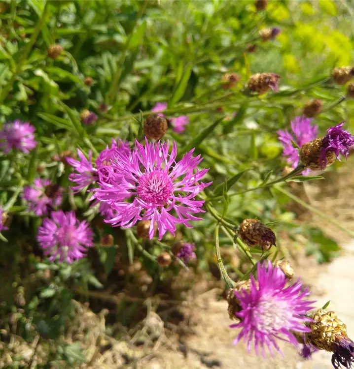 Aparte Schönheit in dunklem Purpurton: Die kugeligen Blütenköpfchen der Schwarzen Flockenblume erinnern auf den ersten Blick an Distelblüten. Und wie diese werden sie besonders gerne von Schmetterlingen besucht. Man kann sie auch als dekorative Zugabe in bunte Sommersalate geben. Anders als bei ihren Verwandten fehlen die äußeren Randblüten. Die dunklen purpurfarbenen Blüten mit becherförmigem Blütenkelch bestehen nur aus winzigen Röhrenblüten. Die Blütenstände sitzen endständig auf einem aufrechten, nur spärlich belaubten Stängel. Sein oberes Ende kann leicht doldentraubig verzweigt sein. Die Laubblätter sind grün, lanzettlich bis oval und leicht grau behaart. Im oberen Stängelbereich sind sie ganzrandig, im unteren Bereich gezähnt bzw. gelappt. In der Volksheilkunde werden die Wurzeln und Samen der Schwarzen Flockenblume zur Wundheilung sowie wegen ihrer schweiß- und harntreibenden Wirkung benutzt. Die anspruchslose Wildstaude gedeiht gut an lichten Gehölzrändern, wo man sie gut kombinieren kann mit Chaerophyllum aromaticum (Gewürz-Kälberkropf), Hierochloe odorata (Duftendes Mariengras) und Alchemilla epipsila (Kaukasus-Frauenmantel).