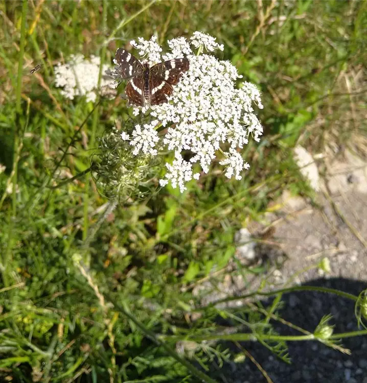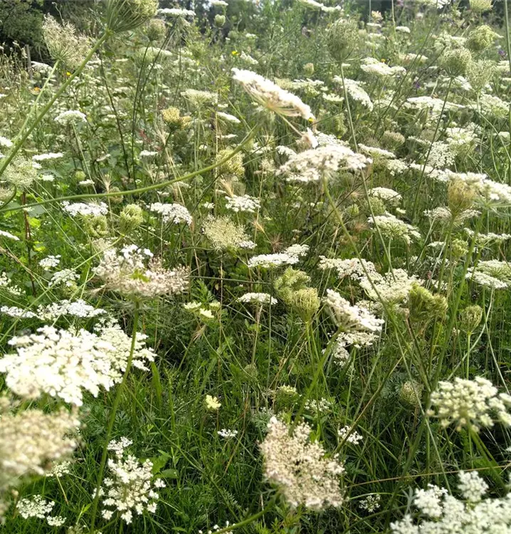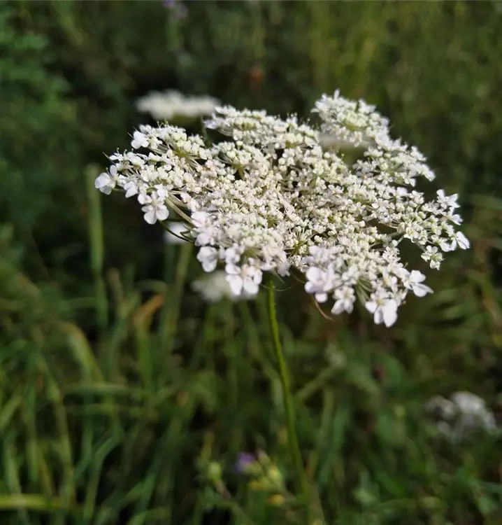 Attraktiver, anspruchsloser, zweijährige Doldenblütler: Die Wilde Möhre ist die Ursprungspflanze unserer Gartenmöhre und lässt sich in Mitteleuropa bis in die jüngste Steinzeit nachweisen. In der Volksmedizin wurde und wird ihr frisch gepresster Wurzelsaft oder ein Tee (aus der bleichen Wurzel und dem Kraut zubereitet) als Stärkungsmittel eingesetzt. Das zerriebene, frische Kraut hat man mit Honig gemischt und zur Wundheilung verwendet. Der mit Zucker zu Sirup eingekochte Möhrensaft galt als gutes Mittel bei Husten. Die Wilde Möhre blüht vom Sommer bis in den Herbst in üppigen, weißen Dolden. Bei Feuchtigkeit krümmen sich diese vogelnestartig zusammen. In der Doldenmitte sitzt, schwarzpurpur gefärbt, eine sterile „Mohrenblüte“, die auf den ersten Blick aussieht, wie ein kleines Insekt. Das Laub der Wilden Möhre ist fein fiederteilig zerschlitzt und hat haarfeine Zipfel. Im Garten lässt sie sich in Blumenwiesen oder auf freien Flächen mit voller Sonne und nahrhaftem Boden kultivieren. Man lässt besser nur einen Teil der Samen zur Reife kommen, da sie sehr ausbreitungsfreudig ist. Gefällig und ursprünglich wirkende Kombinationen ergeben sich mit Nachtkerze (Oenothera biennis), Pastinak (Pastinaca sativa) und der Wilden Karde (Dipsacus fullonum).