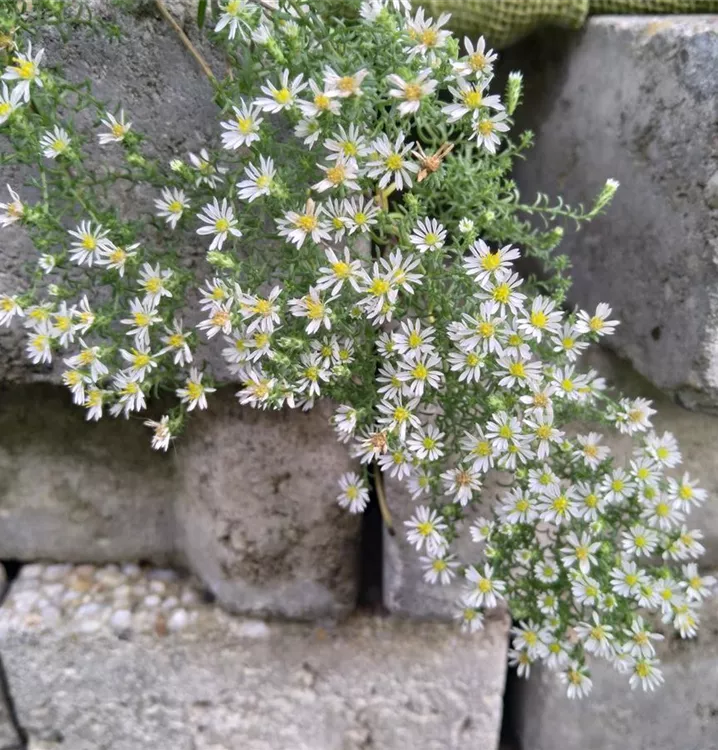 Schneeflöckchen… und das schon im September! Die hübsche, kleine Teppich-Aster ist die einzige bodendeckende Art unter den Astern. Sie bildet stetig neue Triebe, die sich fächerartig ausbreiten und mit der Zeit zu teppichartigen Beständen heranwachsen. Mit ihren zahllosen feinstrahligen Sternblüten zaubert sie dann im Herbst dichte, weiße Blütenschleier in den Garten. Ihre winzigen Körbchenblüten mit gelber Mitte zeichnen sich deutlich von den dunkelgrünen, linealischen Laubblättern ab. Sie sitzen in lockerrispigen Blütenständen am oberen Ende der stark verzweigten Stängel. Im Naturgarten gedeiht die Teppich-Aster sowohl an lichten Gehölzrändern und unter Sträuchern, wie auch in der vollen Sonne. Man kann sie auch von Mauern und Treppenabsätzen herunterwachsen lassen. Im Kübel gepflanzt, fühlt sich sie ebenfalls wohl. Oder stellen Sie sich folgende Kombination für Ihr Staudenbeet vor: Die niedrige weiße Teppich-Aster leuchtet zwischen höheren blaublühenden Aster -Sorten und Wolken aus violetten Verbenen (Verbena bonariensis). Dazwischen stehen die feinen Horste des Federgras (Achnatherum calamagrostis). Einfach wunderbar.