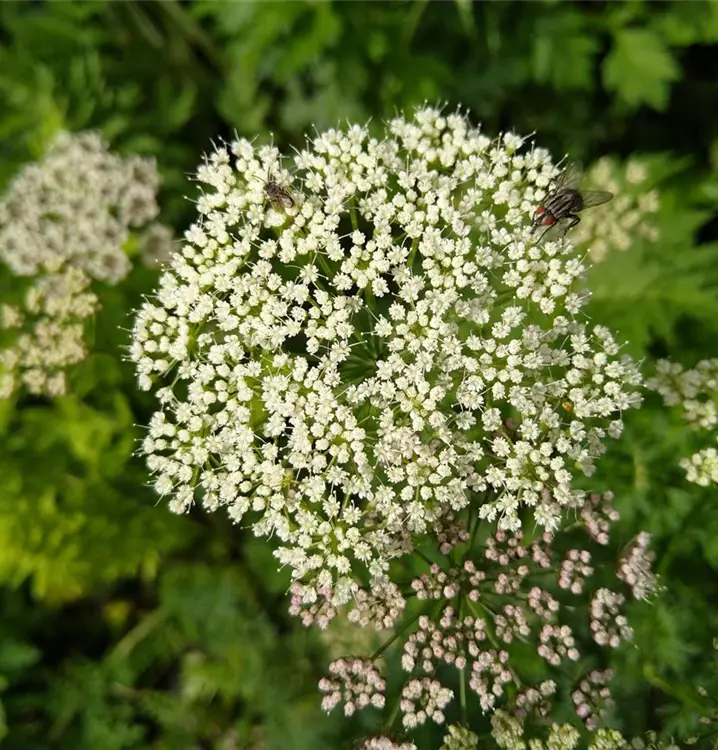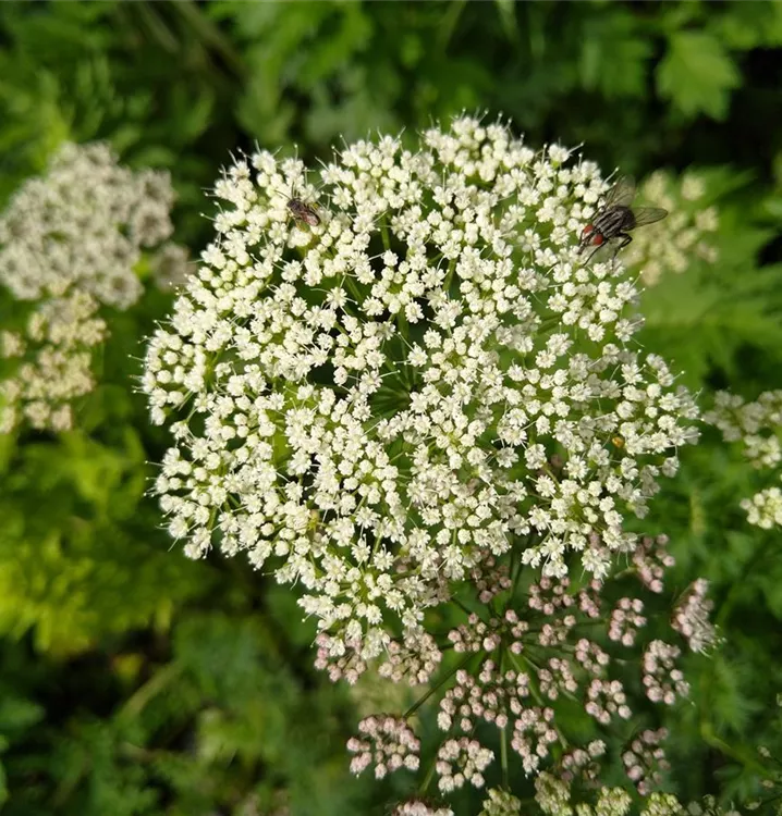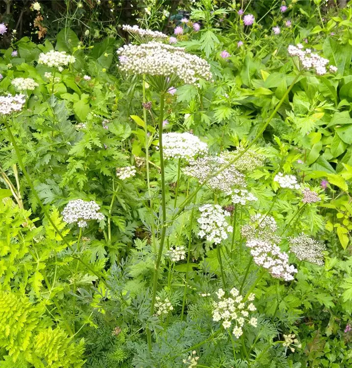 Die Heilwurz ist keine sehr langlebige Pflanze: Sie steckt alle Kraft in die Ausbildung reich verzweigter Stängel und strahlend weißer Blütenstände. Lässt man die Samen zur Reife kommen, erhält sich die Pflanze aber zuverlässig durch Selbstaussaat am Standort. Besonders schön sind größere Gruppen der Heilwurz in wiesenartigen Flächen, z.B. zusammen mit Centaurea scabiosa (Skabiosen-Flockenblume) und Anthemis tinctoria (Färber-Hundskamille) . Hier setzt sie auch schon vor der Blüte mit ihrem zerteilten, fiederschnittigen Laub wirkungsvolle Akzente. Die leuchtenden Doldenblüten der Heilwurz werden von einem aufrechten, dunkelroten Stängel getragen und scheinen über den sattgrünen, grundständigen Blattschöpfen zu schweben. Sie sind den Sommer über Tummelplatz für zahlreiche kurzrüsselige Insekten, die leicht an den offen liegenden Nektar gelangen können. Gedeiht auch gut im Schotterbeet.