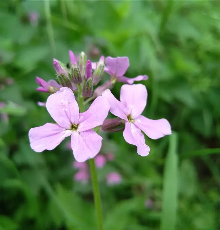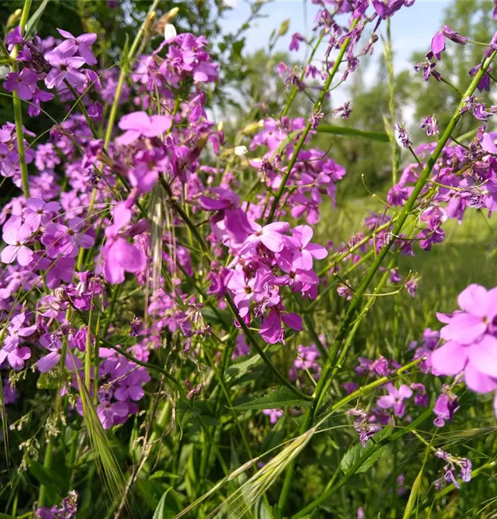 Abends duftet sie besonders intensiv: Daher der Name. Die Gewöhnliche Nachtviole gehört zu den Kreuzblütengewächsen und wird wegen ihrem betörenden Duft schon seit Jahrhunderten im Garten kultiviert. Man hat sie ab und an auch für heilkundliche Zwecke benutzt. Hier hat die Gewöhnliche Nachtviole aber nie große Bedeutung erlangt. Ihre dünnen, rauhaarigen Stängel sind locker besetzt mit hellgrünem lanzettlichem Laub, das an den Blatträndern gesägt ist. Obenauf sitzen langgestielte, lockere Blütentrauben. Die Gewöhnliche Nachtviole erreicht eine ordentliche Höhe. Man kann sie direkt am Zaun pflanzen, wo sie im Frühsommer mit ihren freundlichen Blüten die Besucher begrüßt. Oder im Beet mit historischen Rosen zu farbenprächtigen Pflanzungen kombinieren. Die Gewöhnliche Nachtviole ist nicht sehr langlebig, erhält sich aber zuverlässig durch Selbstaussaat. Gute Bienenweide. Gute Schnittblume.