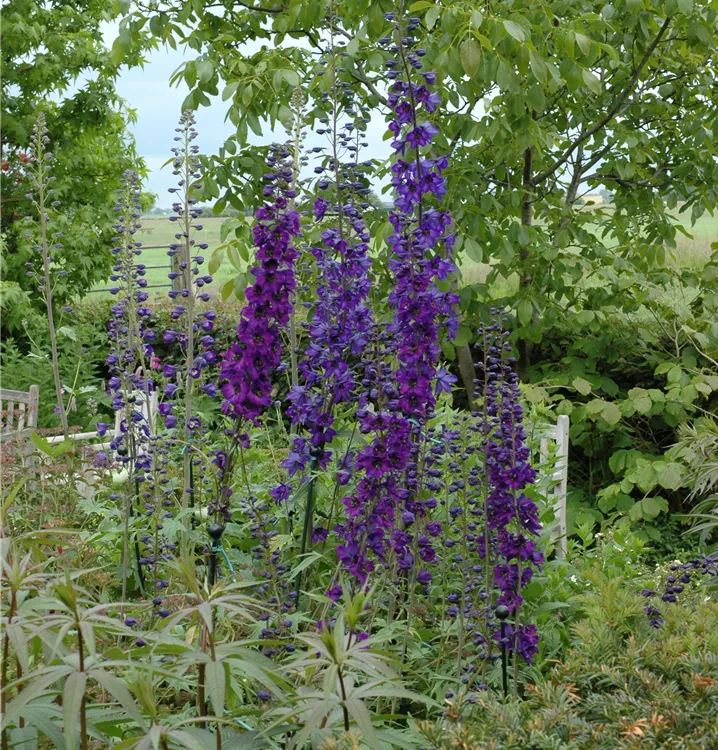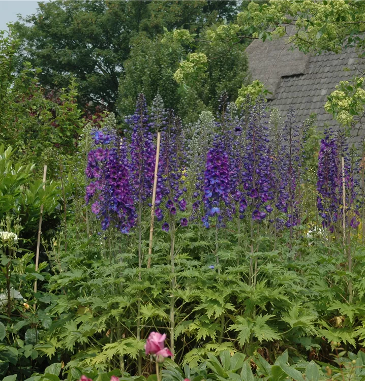 Beeindruckender, stattlicher Rittersporn: Der Hohe Rittersporn kann mannshoch werden und ist gut standfest. Dennoch gehört er zu den anspruchsvolleren Beetstauden und bedarf einiger Aufmerksamkeit. Im Frühjahr muss stets der schneckengefährdete Austrieb im Auge behalten werden. Im nahrhaften Gartenboden entwickeln sich die buschigen Horste aus dem handförmig gelappten und spitz gezähnten Laub dann zügig. Bis zum Sommer haben sich die aufrechten Stängel entwickelt. Es kann nicht schaden, sie mit einer Stütze zu versehen. Und dann wird der aufmerksame Gärtner mit den herrlichen, mittelblauen Blütentrauben belohnt. Sie sind locker besetzt mit den typischen, trichterförmigen Blüten. Passende Begleitpflanzen sind Valeriana officinalis (Echter Baldrian) und Cephalaria alpina (Alpen-Schuppenkopf). Gute Schnittblume. Giftig.