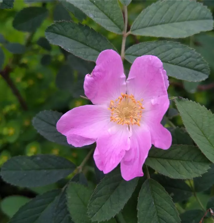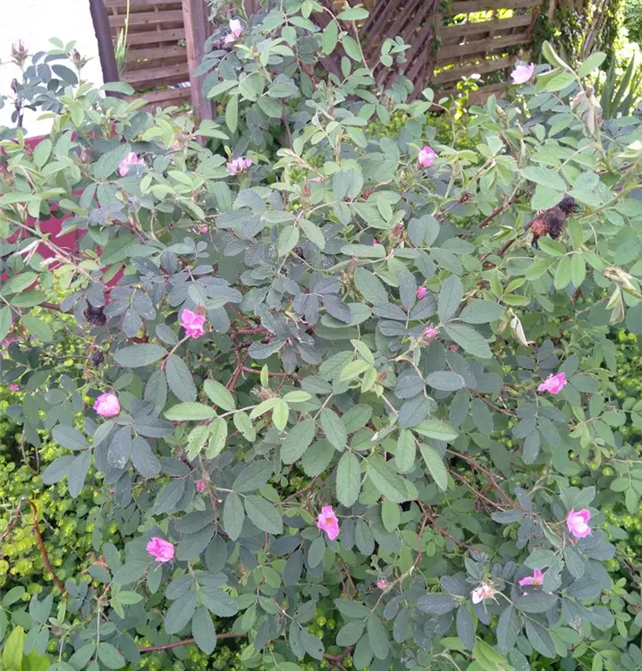 Kräftiger Wuchs bis 200 cm Höhe. Blüten, reinrosa, groß, halbgefüllt, schwach duftend und reichblühend im Juni/Juli. Große dunkelorangerote und mit Drüsenhaaren besetzte Hagebutten im Spätsommer. Sollte als Einzelstrauch gepflanzt werden.
